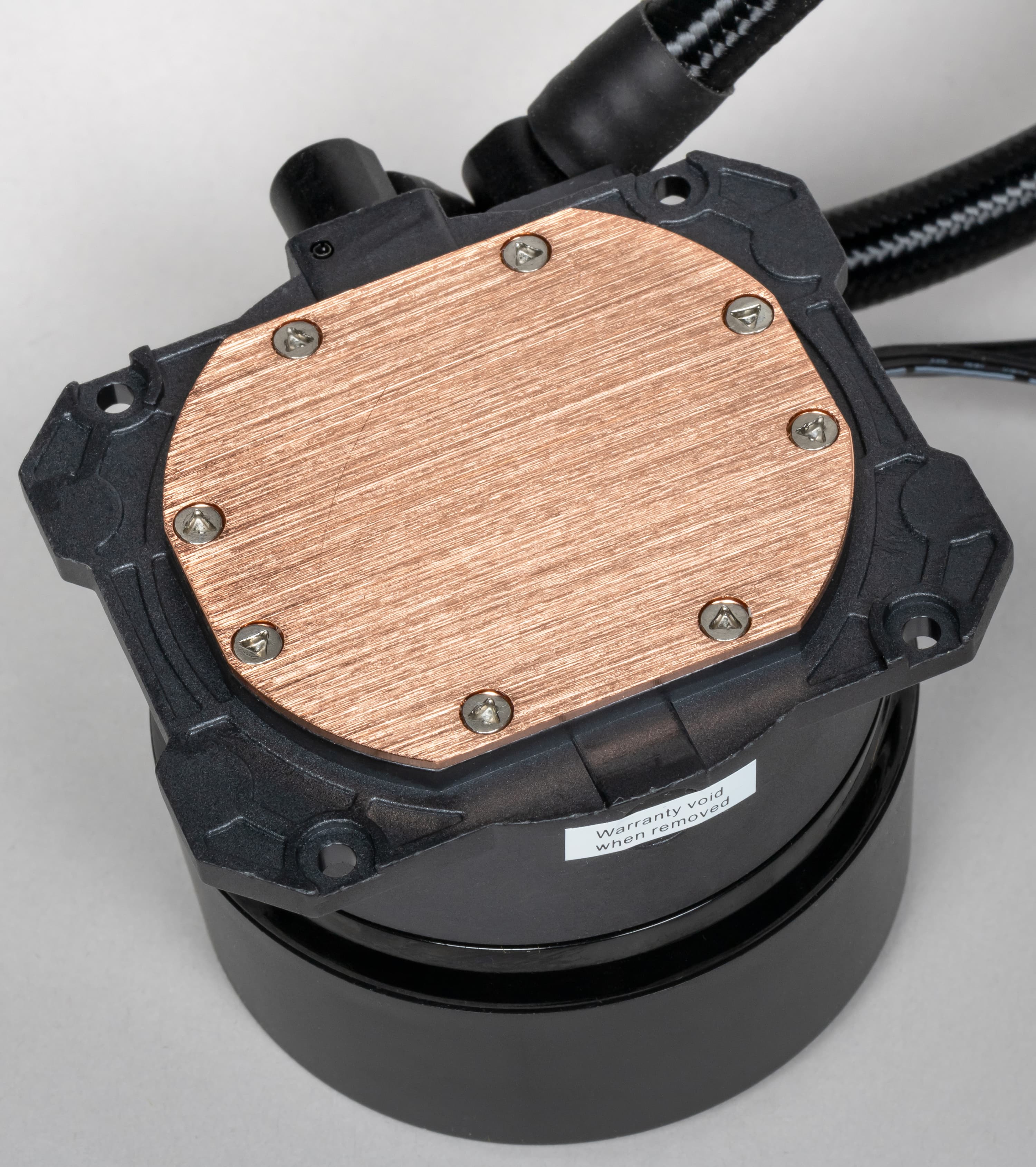 Система герметичная, заправлена, готова к использованию. Помпа интегрирована в один блок с теплосъемником. Производитель указывает, что водоблок двухкамерный, видимо сверху камера помпы, а снизу — камера теплосъемника. Подошвой теплосъемника, непосредственно прилегающей к крышке процессора, служит медная пластина толщиной 1,5 мм. Ее внешняя поверхность шлифованная, но не полированная и чуть-чуть, где-то на 0,1 мм, выпуклая к центру.