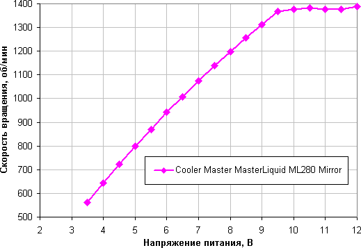 Регулировка с помощью напряжения позволяет получить устойчивое вращение в немного более широком диапазоне. Горизонтальный участок на графике выше в диапазоне от 9,5 до 12 В показывает, что в вентиляторе применяется система стабилизации скорости вращения, которая задается с помощью КЗ ШИМ. Вентиляторы останавливаются при снижении напряжения до 2,9—3,0 В, но устойчивое вращение начинается только от 4,8 В и выше. Вентиляторы, видимо, допустимо подключать к источнику с напряжением 5 В.