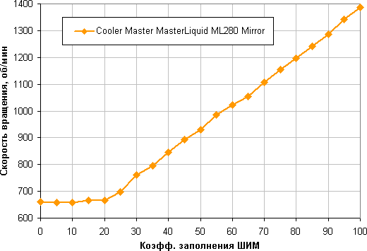Хороший результат — монотонный рост скорости вращения при изменении коэффициента заполнения от 20% до 100%, диапазон регулировки скорости вращения довольно широкий. При снижении коэффициента заполнения (КЗ) до 0 вентиляторы не останавливаются. Это может иметь значение, если пользователь хочет создать гибридную систему охлаждения, которая при низкой нагрузке работает полностью или частично в пассивном режиме.