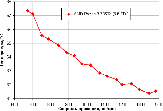 Зависимость температуры процессора при его полной загрузке от скорости вращения вентиляторов: