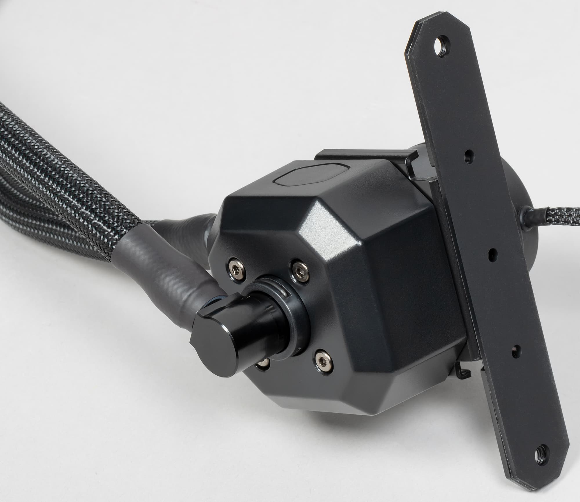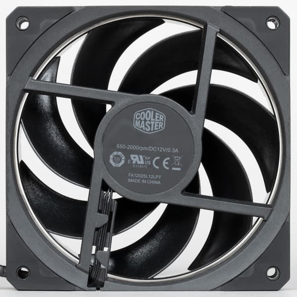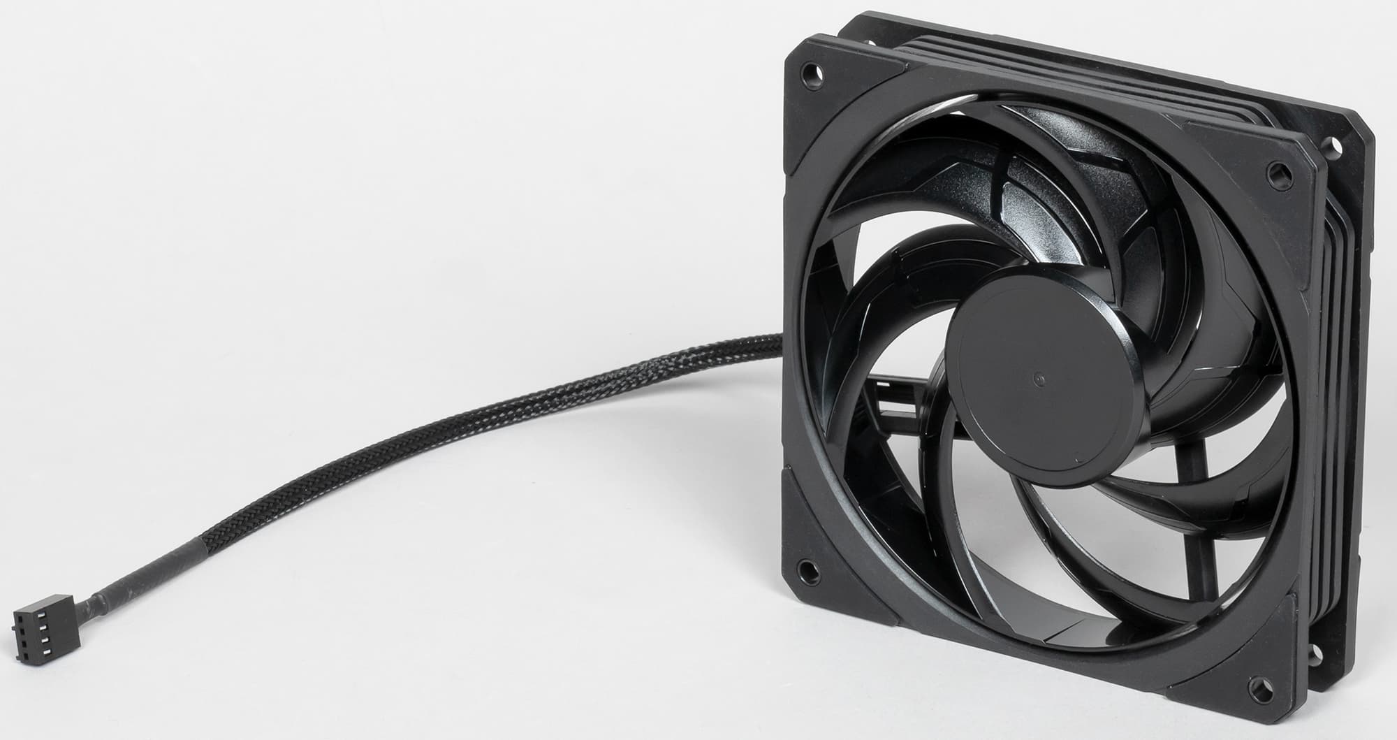 Лопасти крыльчатки заключены в кольцо, что может повышать эффективность вентилятора. Вентилятор имеет четырехконтактный разъем (общий, питание, датчик вращения и управление ШИМ) на конце кабеля питания длиной 30 см. Этот кабель заключен в скользкую плетеную оболочку. Согласно легенде, оболочка уменьшает аэродинамическое сопротивление, но принимая во внимание толщину плоского трех/четырехпроводного кабеля внутри этой оболочки и ее внешний диаметр, мы в правдивости этой легенды сильно сомневаемся. Впрочем, оболочка позволит сохранить единый стиль оформления внутреннего убранства корпуса. Оболочка есть и у разветвителя питания вентиляторов и помпы. Длина каждой из четырех веток разветвителя — 30 см, а от разъема для подключения помпы отходит еще одна ветка той же длины с разъемом для подключения к разъему для кулера процессора, что позволяет отслеживать скорость вращения помпы. Согласно задумке производителя, вентиляторы и помпа всегда работают от 12 В на максимальной скорости, а скорость вращения вентиляторов не отслеживается. Впрочем, ничто не мешает пользователю подключить вентиляторы так, как ему хочется. С помпой проделать это сложнее, поскольку разъем на кабеле ее питания отличается от типичного разъема вентиляторов.