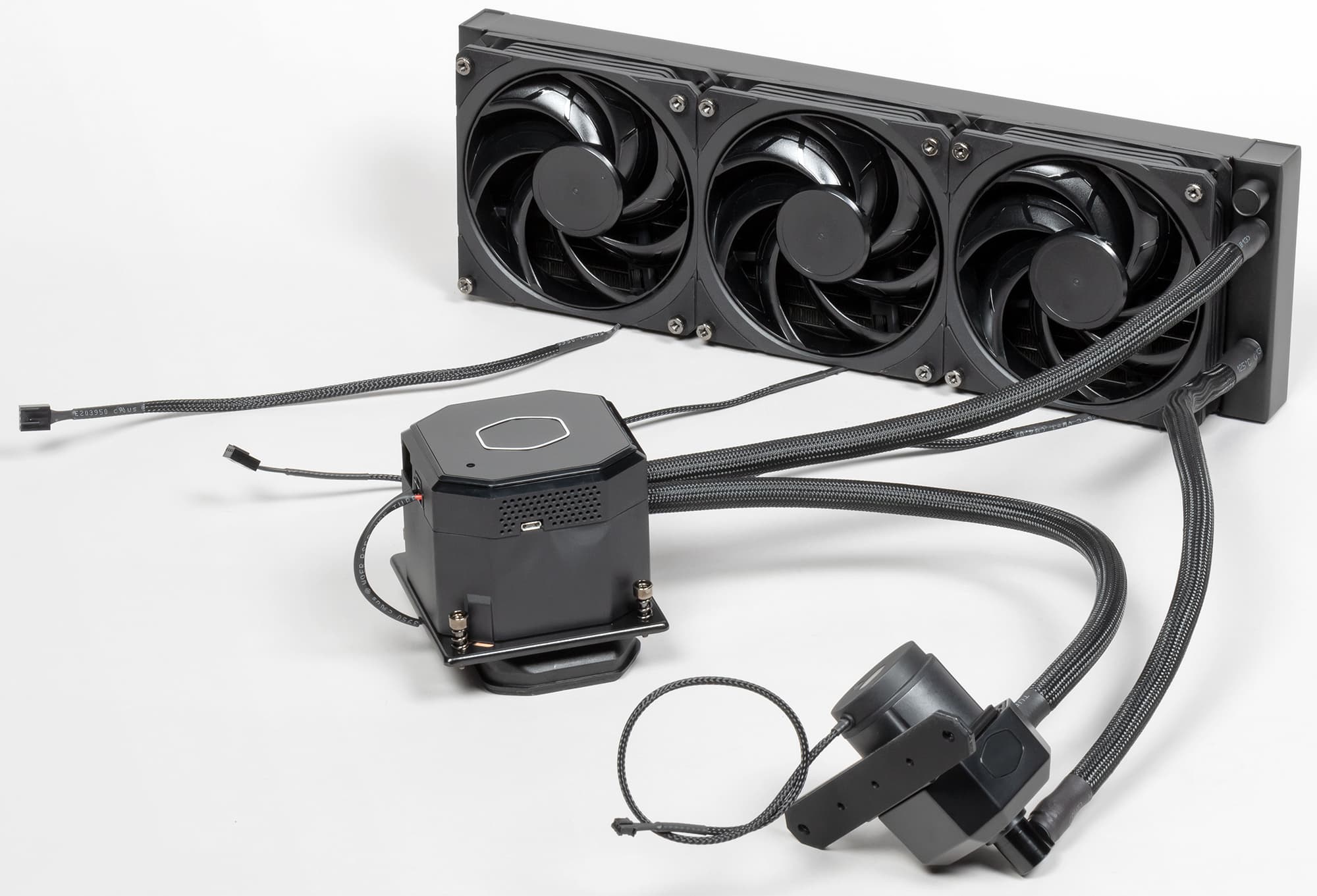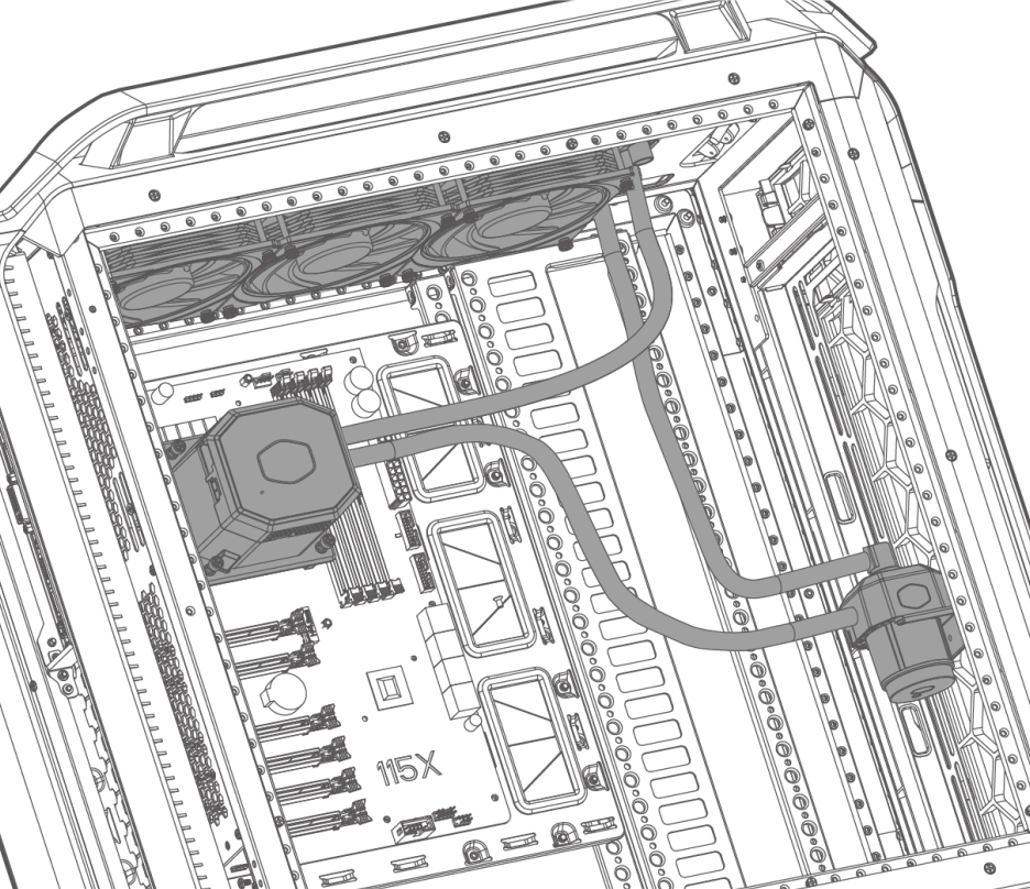 Шланги, кольцом соединяющие водоблок, помпу и радиатор, упругие, но относительно гибкие, они заключены в оплетку из скользкого пластика, внешний диаметр шлангов с оплеткой — примерно 12 мм. Длина шлангов по сегментам с учетом штуцеров: 36 см (водоблок — помпа), 39 см (помпа — радиатор), 33,5 см (радиатор — водоблок). Длины шлангов вполне достаточно для размещения компонентов системы в типичном корпусе так, как это рекомендует производитель: помпа — на передней стенке, радиатор — на верхней.