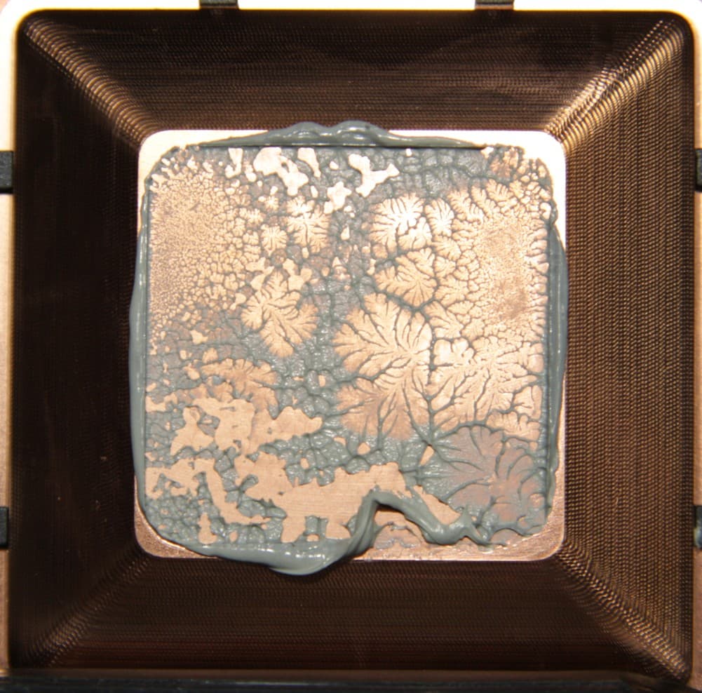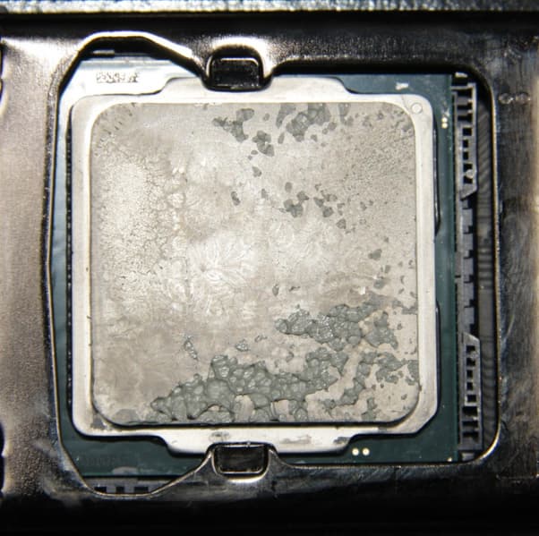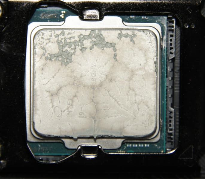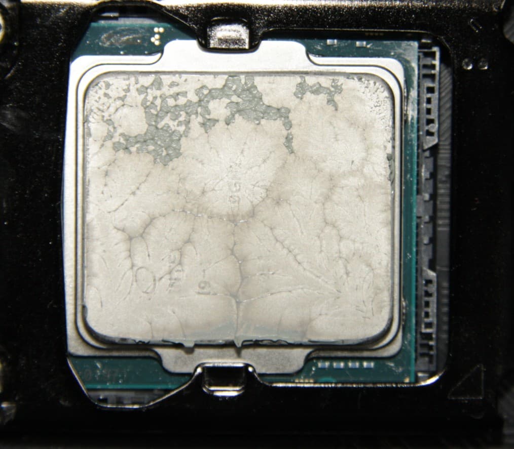 Видно, что в обоих случаях термопаста распределилась очень тонким слоем по всей площади крышки процессора, а ее избытки выдавились за края.