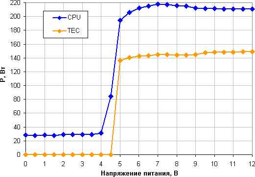 С нашей точки зрения, если не учитывать высокий шум от помпы, то основной проблемой является слишком большая мощность, потребляемая элементом Пельтье. Для иллюстрации этого приведем график зависимости мощности, потребляемой процессором Intel Core i9-10900K (CPU) и элементом Пельтье (TEC) в зависимости от напряжения питания помпы и вентиляторов: