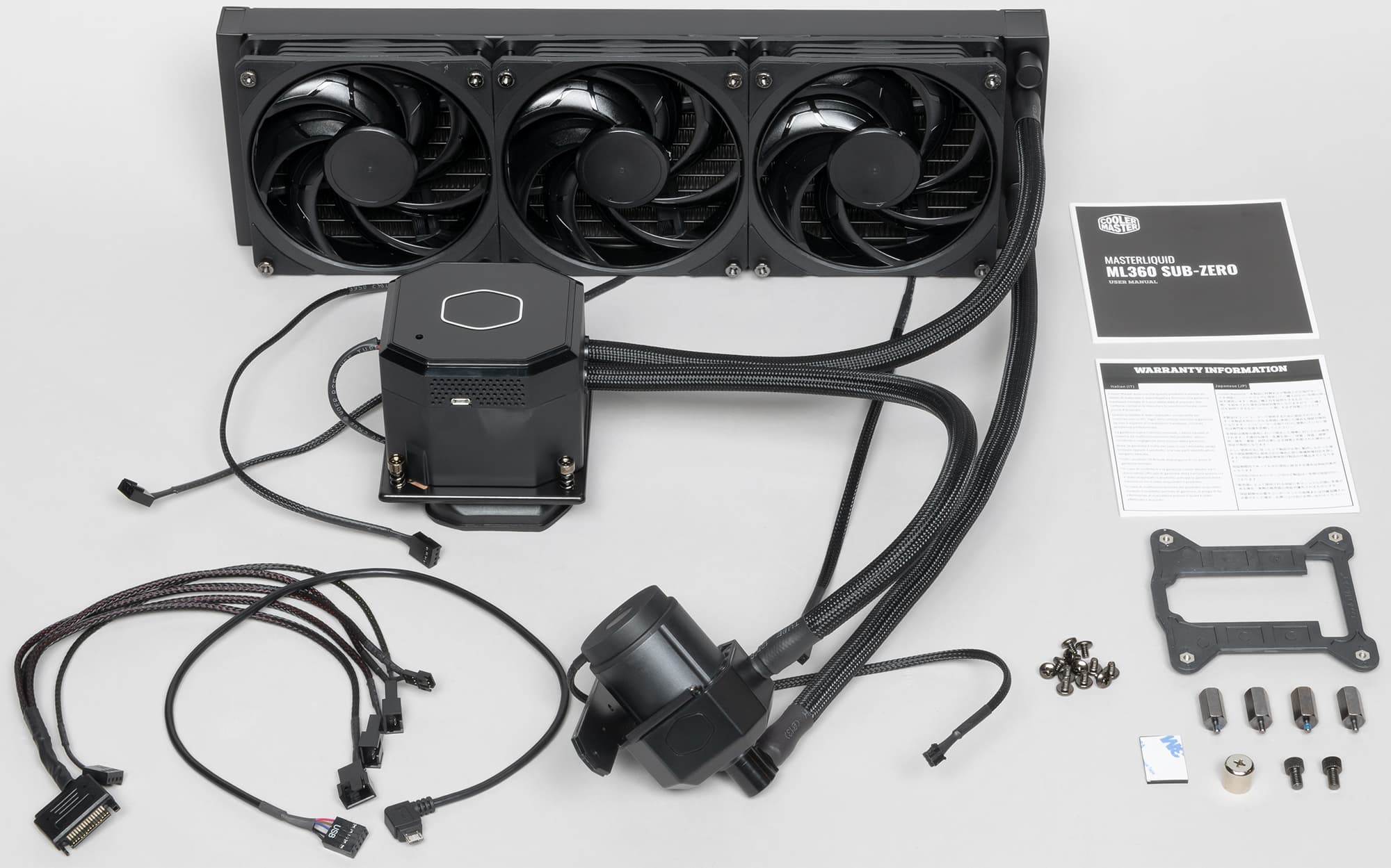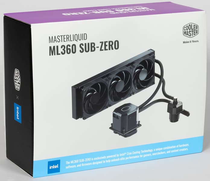 Поставляется система жидкостного охлаждения Cooler Master MasterLiquid ML360 Sub-zero в большой коробке из среднего по толщине гофрированного картона. На картонной обечайке коробки, оформленной в фирменных цветах, изображен сам продукт, а также перечислены основные особенности и технические характеристики, есть чертежи водоблока, помпы и радиатора с главными размерами. Надписи преимущественно на английском, но некоторые из них продублированы на нескольких языках, включая русский. Для защиты и распределения деталей используются форма и прокладка из вспененного полиэтилена. Аксессуары расфасованы в пластиковые пакеты и упакованы в картонную коробочку. Подошва теплосъемника защищена кожухом из жесткого пластика.