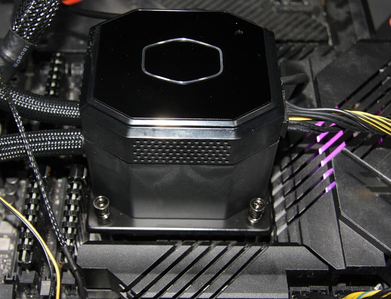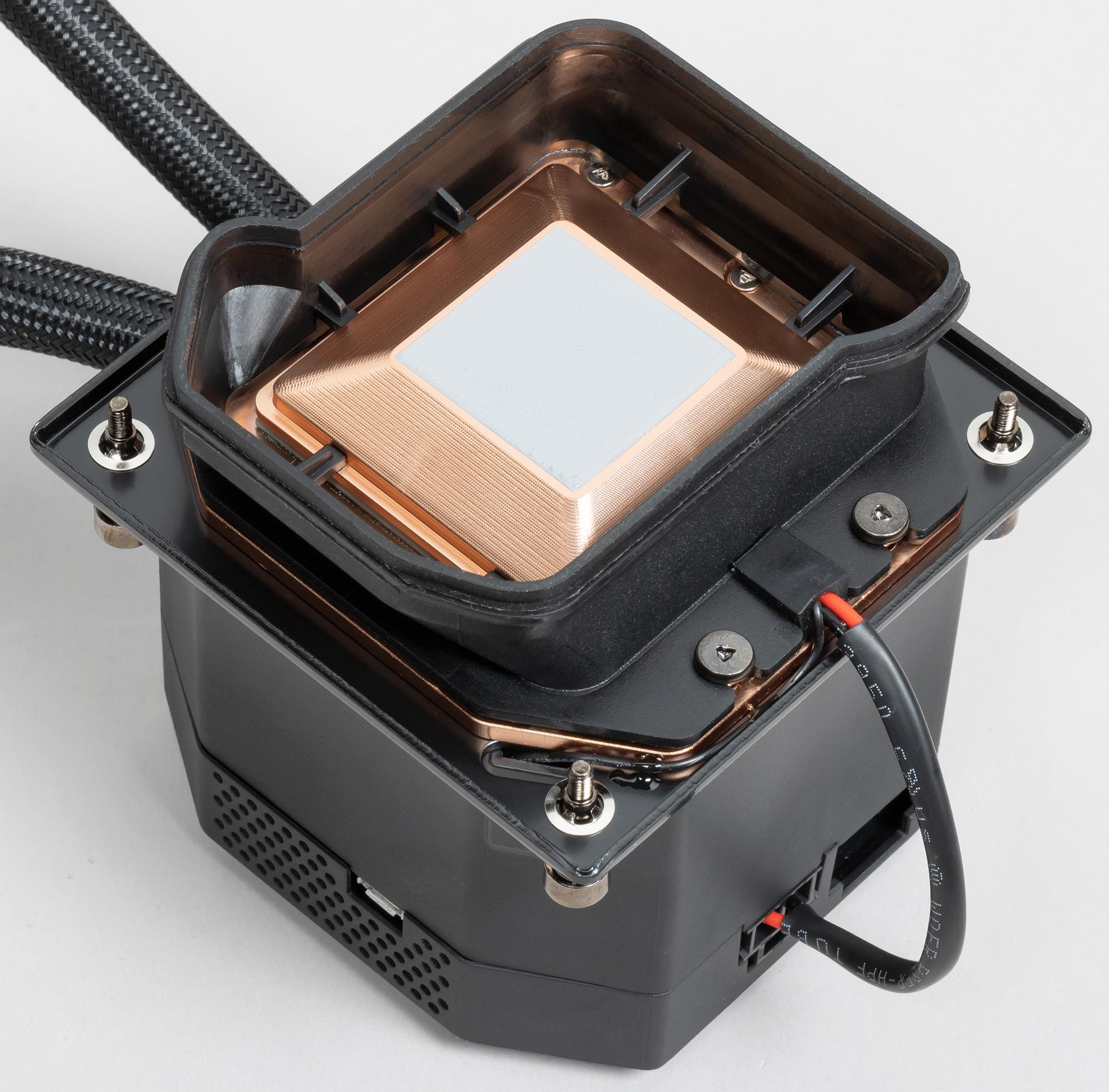(При 4,5 В помпа остановилась, поэтому СЖО перешла в аварийный режим и элемент Пельтье отключился, а процессор из-за отсутствия охлаждения перешел в экономичный режим.) В рабочем диапазоне — от 12 до 5 В — потребление только элемента Пельтье составило 140—150 Вт, а процессора — 194—218 Вт. Получается, что при прочих равных условиях СЖО с таким термоэлектрическим преобразователем должна рассеивать дополнительно эти самые 140-150 Вт, что много на фоне потребления процессора. В принципе, теплосъемник с элементом Пельтье имеет пониженную температуру, а теплоноситель, наоборот, повышенную, при этом оба фактора повышают общую эффективность (все-таки разница с MasterLiquid ML360 Illusion составляет не 140—150 Вт, в всего 20—30 Вт), но этого недостаточно. Возможно, оснастив такой водоблок более мощной и тихой помпой, радиатором с большей площадью, а также шлангами с бо́льшим диаметром, охлаждающую способность можно повысить настолько, что тепло, выделяемое самим элементом Пельтье, будет минимально влиять на эффективность системы, и польза от термоэлектрически охлаждаемого теплосъемника уже будет заметной. Также в теории такой теплосъемник может положительно влиять на работу процессора в случае очень кратковременных больших нагрузок, для отработки которых хватит теплоемкости холодного теплосъемника, но проверить это тестами и уж тем более ощутить при реальном использовании ПК вряд ли возможно.