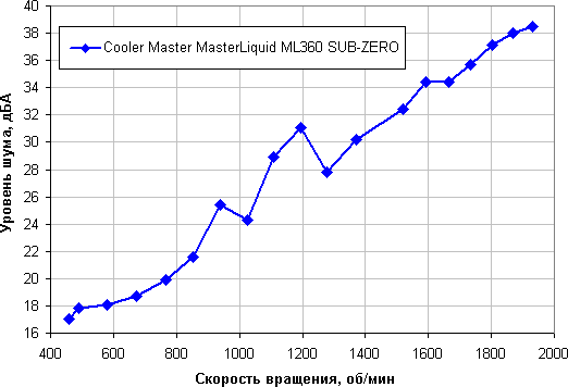 Уровень шума от этой системы охлаждения не очень высокий во всем диапазоне скорости вращения вентиляторов и помпы. Отсутствие монотонного роста уровня шума по мере роста скорости вращения вентиляторов обусловлено аномальным поведением помпы: на некоторых скоростях ее вращения шум от помпы может резко возрастать. Зависит, конечно, от индивидуальных особенностей и других факторов, но где-то от 40 дБА и выше шум, с нашей точки зрения, очень высокий для настольной системы; от 35 до 40 дБА уровень шума относится к разряду терпимых; ниже 35 дБА шум от системы охлаждения не будет сильно выделяться на фоне типичных небесшумных компонентов ПК — корпусных вентиляторов, вентиляторов на блоке питания и на видеокарте, а также жестких дисков; а где-то ниже 25 дБА кулер можно назвать условно бесшумным.
