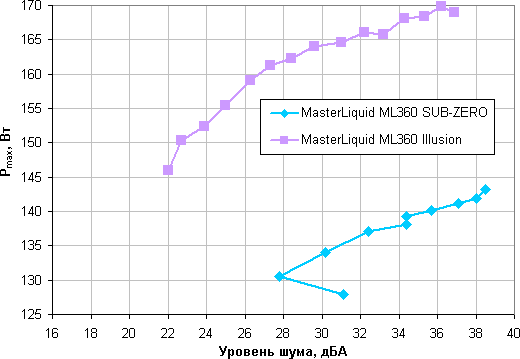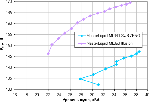 Для тестируемой Cooler Master MasterLiquid ML360 Sub-zero мы использовали данные диапазона, в котором не было перегрева процессоров и снижения частот их работы. Видно, что эта СЖО с термоэлектрическим преобразователем, во-первых, не обеспечивает условно бесшумную (уровень шума 25 дБА и ниже) работу под максимальной нагрузкой даже в почти идеальных условиях; а во-вторых, по эффективности проигрывает простой СЖО с радиатором таких же габаритов — разница в рассеиваемой мощности при том же уровне шума достигает более 20 Вт.