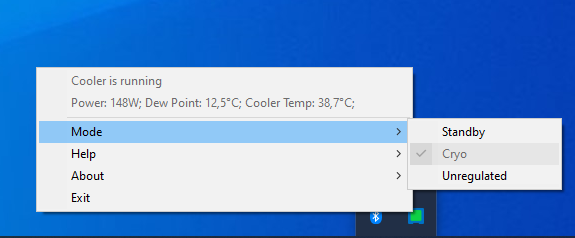 Работой термоэлектрического преобразователя водоблока СЖО Cooler Master MasterLiquid ML360 Sub-zero управляет ПО Intel Cryo Cooling Technology. После запуска этой программы в трее появляется значок, дающий доступ к короткому меню: