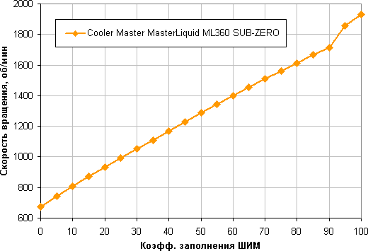 Отличный результат — монотонный рост скорости вращения при изменении коэффициента заполнения от 0% до 100%, диапазон регулировки скорости вращения широкий. При снижении коэффициента заполнения (КЗ) до 0 вентиляторы не останавливаются. Это может иметь значение, если пользователь хочет создать гибридную систему охлаждения, которая при низкой нагрузке работает полностью или частично в пассивном режиме.