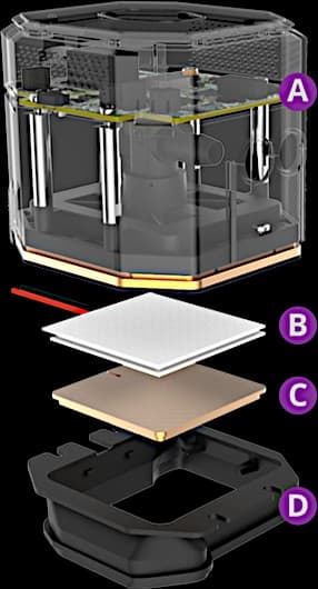Водоблок включает в себя герметизирующую юбку (D), медный теплосъемник (C), термоэлектрический преобразователь (элемент Пельтье — B), модуль жидкостного охлаждения этого преобразователя и электронный управляющий модуль (A). Схема с сайта производителя поясняет устройство водоблока: