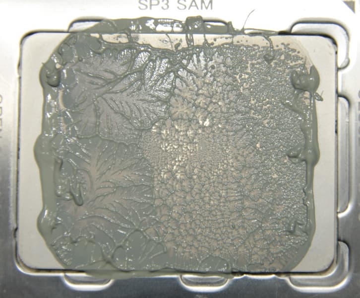 Также была проведена серия дополнительных тестов с процессором AMD Ryzen Threadripper 2990WX. Распределение термопасты на процессоре 2990WX: