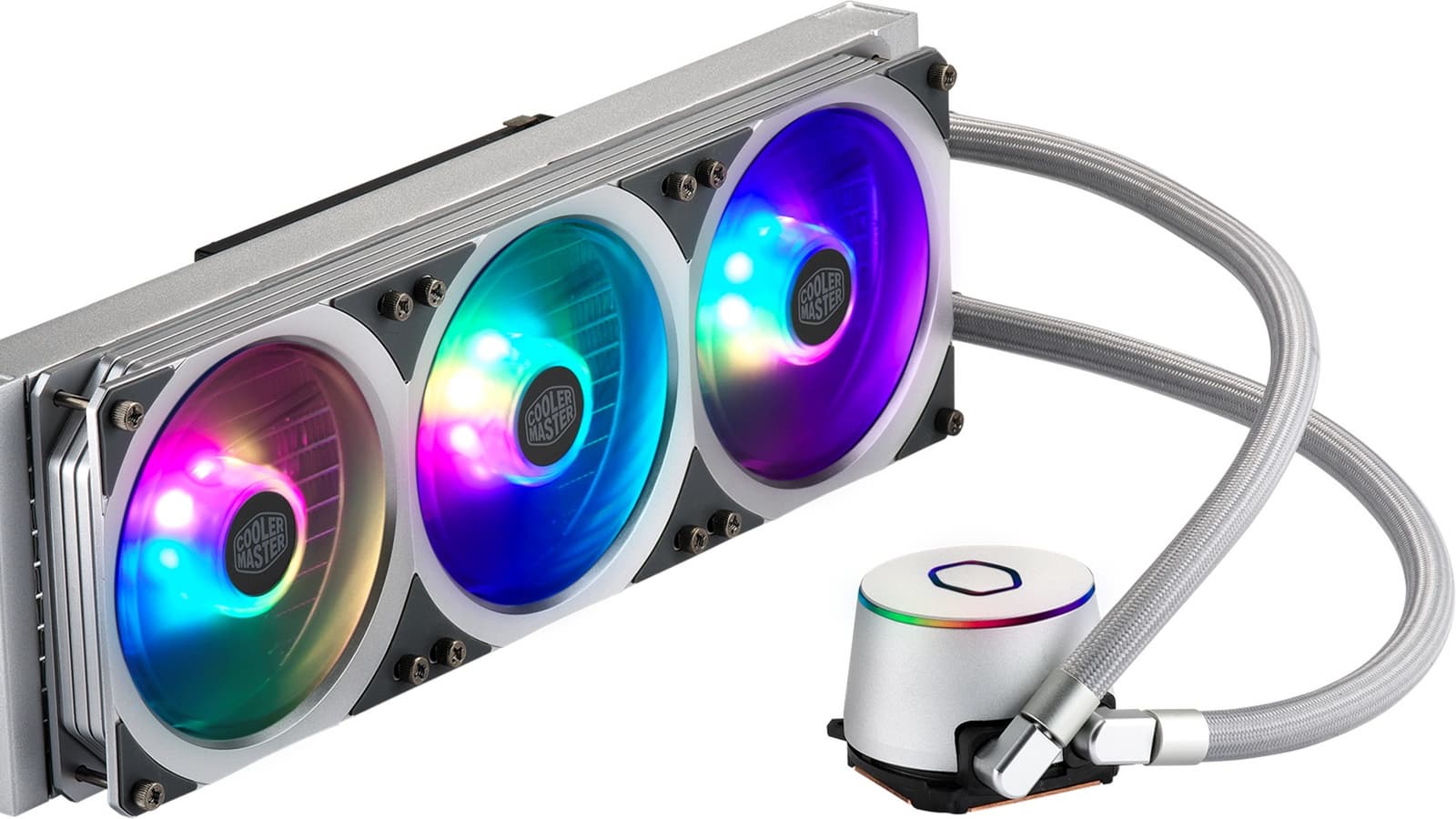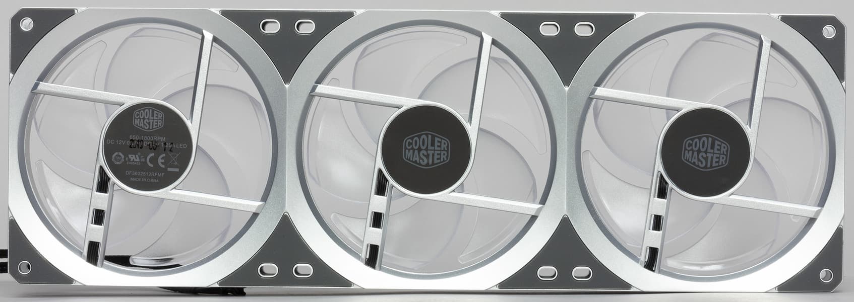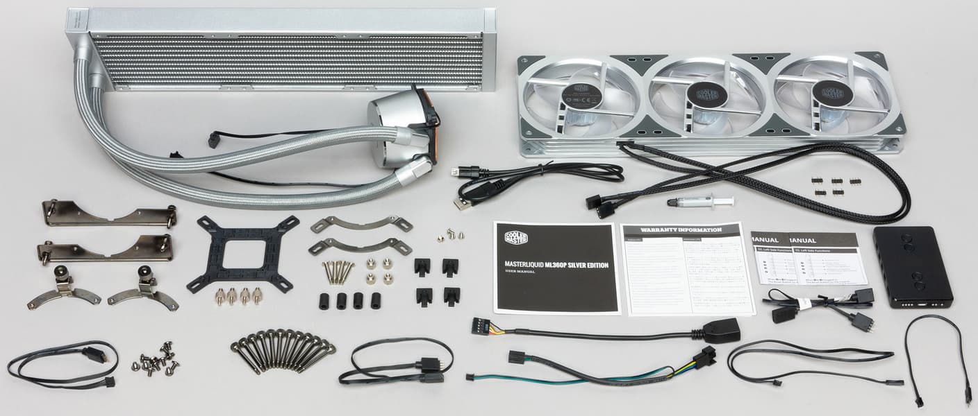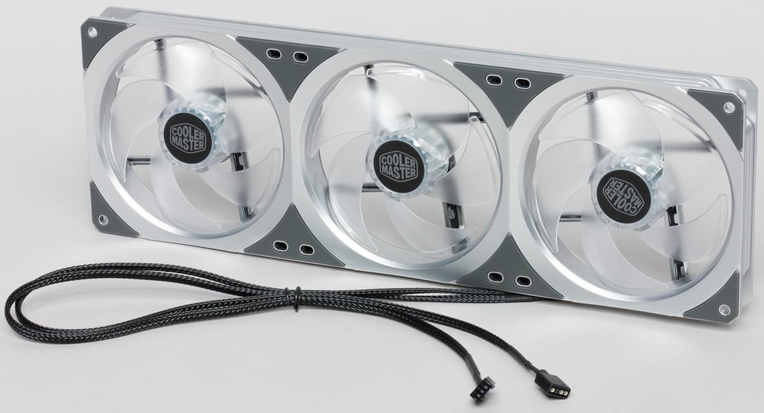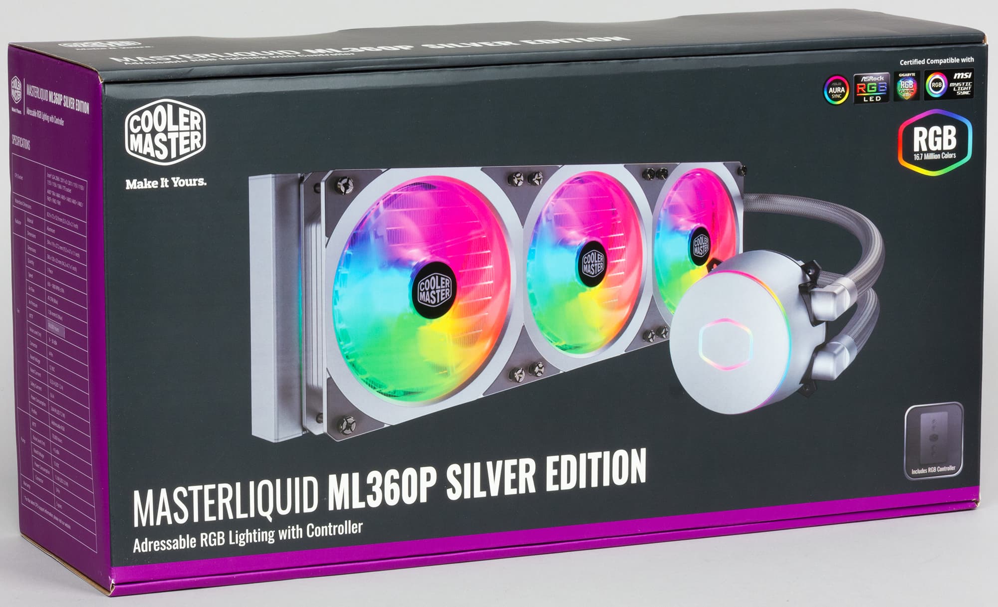 На основе системы жидкостного охлаждения Cooler Master Masterliquid ML360P Silver Edition можно создать условно бесшумный компьютер (уровень шума 25 дБА и ниже), оснащенный процессором типа Intel Core i9-7980XE (Intel LGA2066, Skylake-X (HCC)) или AMD Ryzen Threadripper 2990WX, если потребление процессора под максимальной нагрузкой не будет превышать 230 Вт, а температура внутри корпуса не повысится выше 44 °C. При снижении температуры охлаждающего воздуха и/или менее жестких требованиях к уровню шума пределы мощности можно существенно увеличить. Любители моддинга оценят многоцветную и многозонную статическую или динамическую подсветку вентиляторов и помпы, имеющую стандартное трехконтактное подключение. Подсветкой вентиляторов и помпы можно управлять с помощью, например, контроллера, входящего в комплект поставки. Среди прочих достоинств отметим хорошее качество изготовления, оплетку кабелей и шлангов (как минимум помогающую сохранить единый стиль оформления внутренностей компьютера), подключение контроллера к разъему питания SATA, удобный крепеж вентиляторов и довольно длинные шланги. Особенностями системы являются серебристый цвет и единая рамка на три вентилятора, второе существенно облегчает сборку системы и ее подключение.