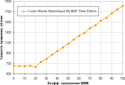 Отличный результат — почти линейный рост скорости вращения при изменении коэффициента заполнения от 20% до 100%, диапазон регулировки скорости вращения широкий. При снижении коэффициента заполнения (КЗ) до 0 вентиляторы не останавливаются. Это может иметь значение, если пользователь хочет создать гибридную систему охлаждения, которая при низкой нагрузке работает полностью или частично в пассивном режиме.