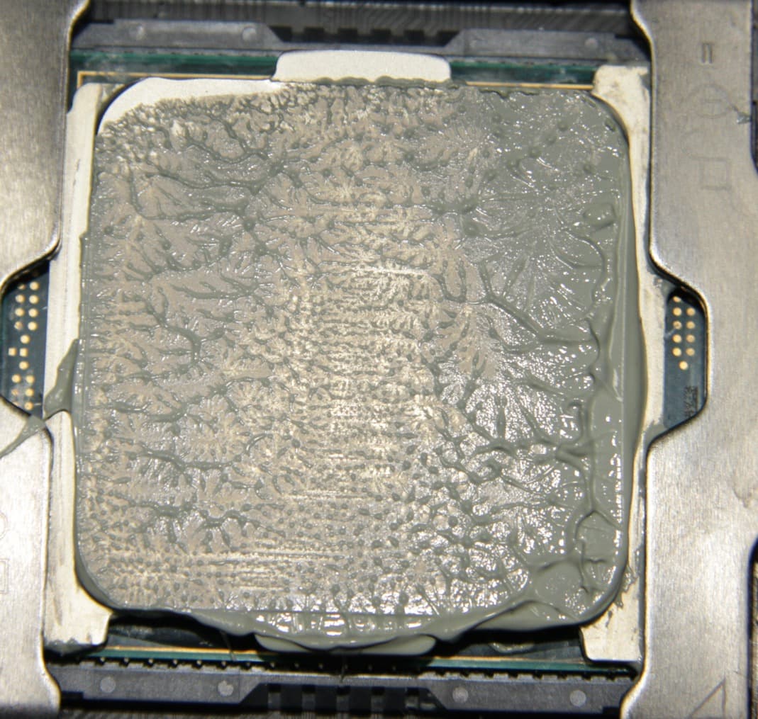 Видно, что термопаста распределилась очень тонким слоем на большей части (и главное в центре) площади крышки процессора, а ее избытки выдавились за края. Участок плотного контакта имеет большую площадь.