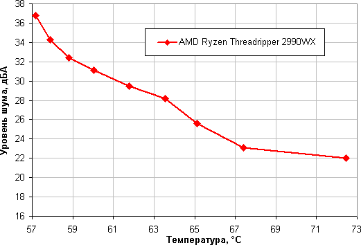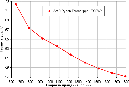 Зависимость температуры процессора AMD Ryzen Threadripper 2990WX при его полной загрузке от скорости вращения вентиляторов: