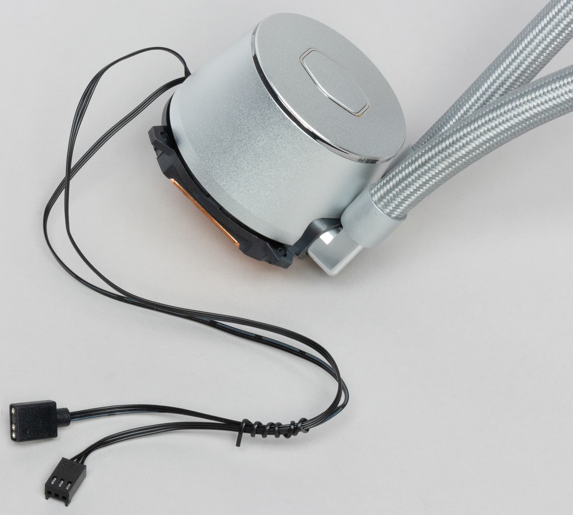 Кабель подсветки и кабель питания от помпы имеют длину по 31 см. Шланги упругие, но относительно гибкие, они заключены в серебристую оплетку из скользкого пластика, внешний диаметр шлангов с оплеткой примерно 13,5 мм. Длина шлангов по гибкой части 36,5 см (не короткие). Г-образные фитинги, изготовленные из алюминиевого сплава, на входе в помпу поворачиваются, что облегчает установку системы.