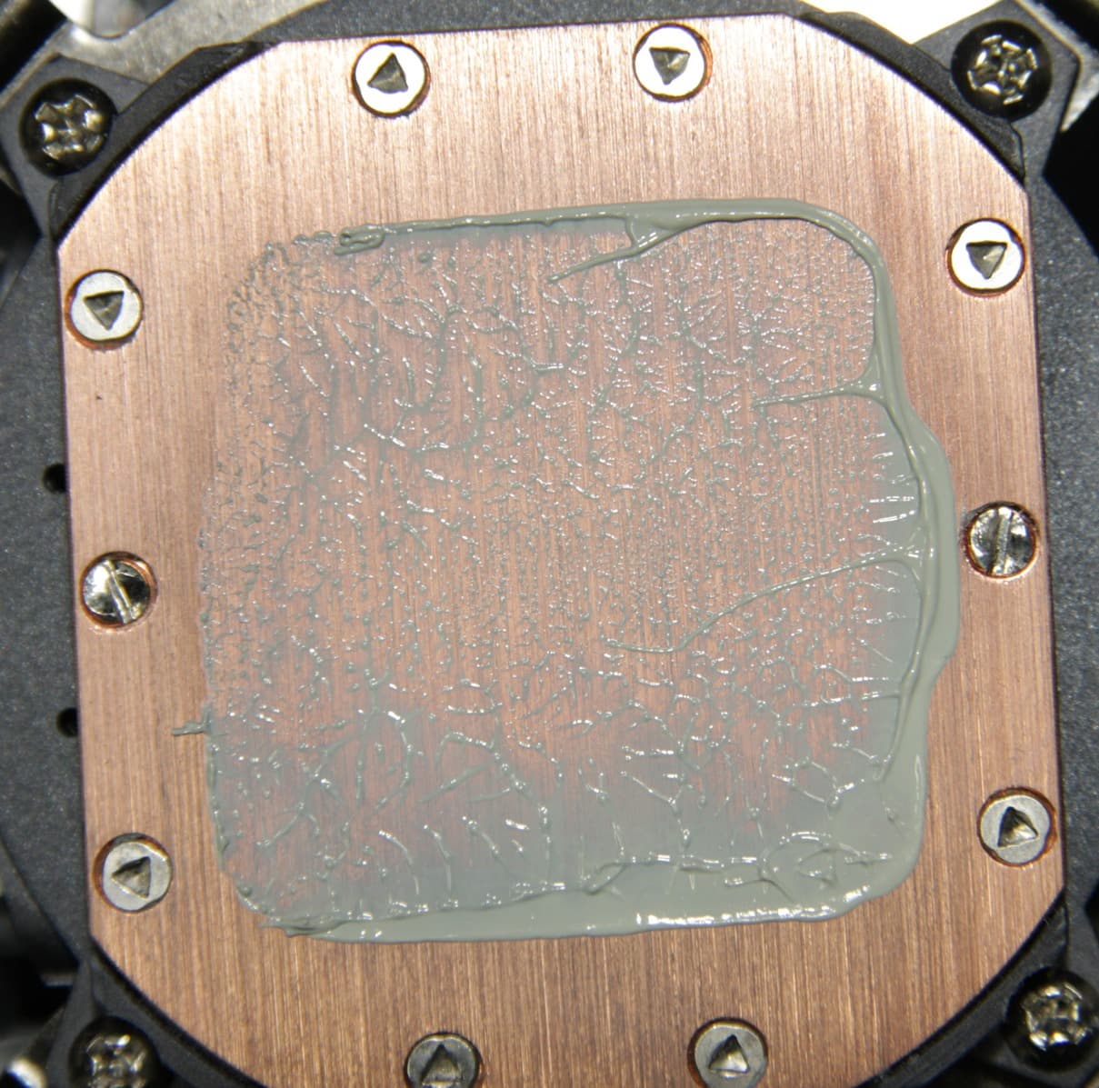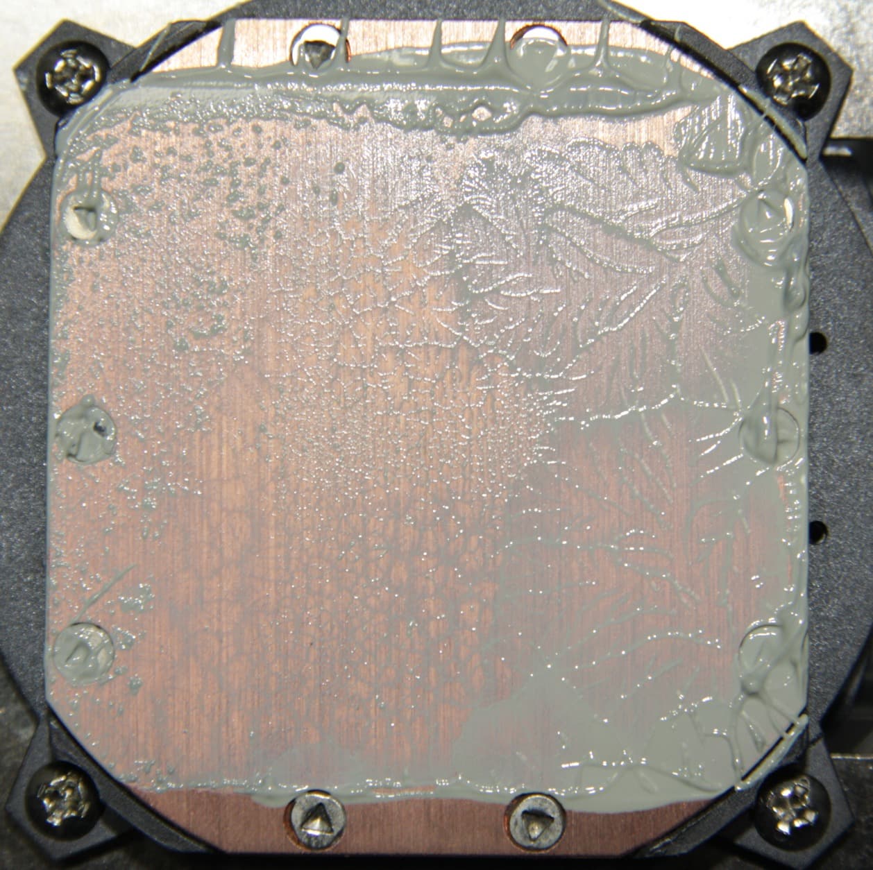 Габариты этой пластины — 61,5×55 мм, а внутренняя часть, ограниченная отверстиями под винты, имеет размеры примерно 51,5×45 мм. Термопаста в маленьком шприце, что, конечно, менее удобно, чем преднанесенный слой. Комплектного запаса термопасты должно хватить раза на три в случае процессоров с небольшой площадью крышки. Во всех тестах использовалась термопаста другого производителя, расфасованная в шприц и чуть более жидкая. Забегая вперед, продемонстрируем распределение термопасты после завершения всех тестов. На процессоре (Intel Core i9-7980XE):
