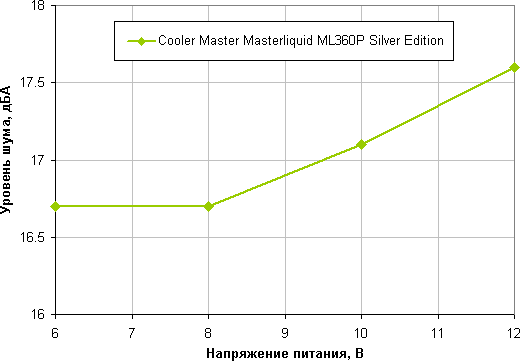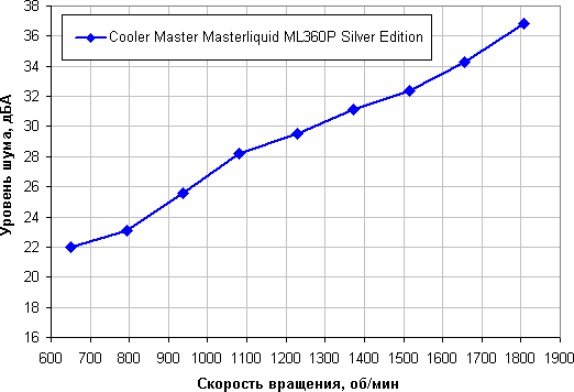 Уровень шума от этой системы охлаждения невысокий во всем диапазоне скорости вращения вентиляторов. Зависит, конечно, от индивидуальных особенностей и других факторов, но где-то от 40 дБА и выше шум, с нашей точки зрения, очень высокий для настольной системы; от 35 до 40 дБА уровень шума относится к разряду терпимых; ниже 35 дБА шум от системы охлаждения не будет сильно выделяться на фоне типичных небесшумных компонентов ПК — корпусных вентиляторов, вентиляторов на блоке питания и на видеокарте, а также жестких дисков; а где-то ниже 25 дБА кулер можно назвать условно бесшумным. Фоновый уровень был равен 16,7 дБА (условное значение, которое показывает шумомер).