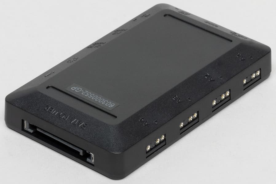 Контроллер подключается к кабелю питания SATA, что гораздо удобнее, чем к периферийному разъему («Molex»). Контроллер имеет 4 выхода (канала) для подключения устройств с адресной RGB-подсветкой (A1—4) и один выход для устройств с RGB-подсветкой (R1).
