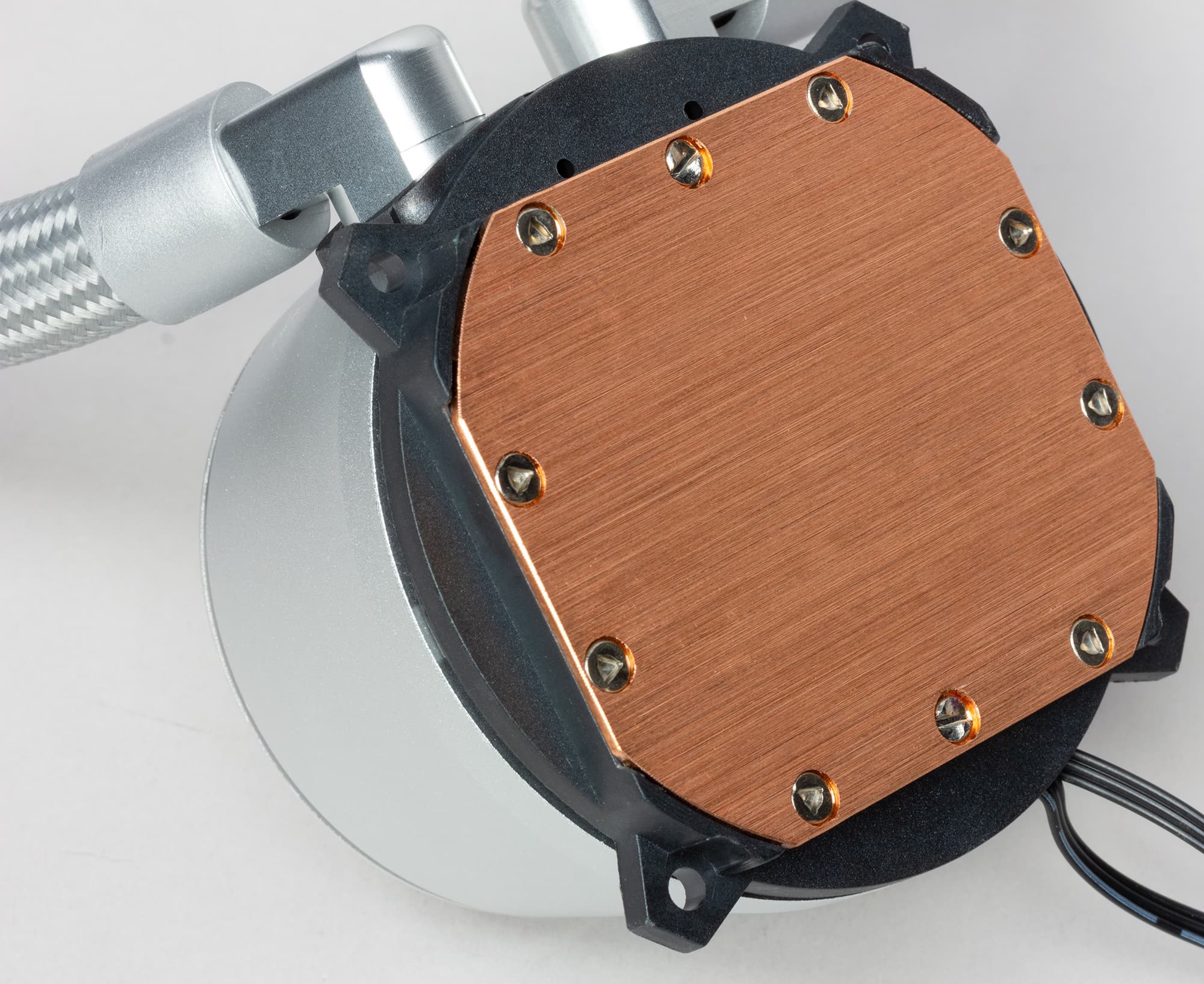 Система герметичная, заправлена, готова к использованию. Помпа интегрирована в один блок с теплосъемником. Производитель указывает, что водоблок двухкамерный, видимо сверху камера помпы, а снизу — камера теплосъемника. Подошвой теплосъемника, непосредственно прилегающей к крышке процессора, служит медная пластина толщиной 1,5 мм. Ее внешняя поверхность шлифованная, но не полированная и чуть-чуть, на 0,01-0,02 мм, выпуклая к центру.