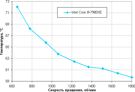 В этом тесте наш процессор Intel Core i9-7980XE при 24 градусах окружающего воздуха не перегревается даже на минимальных оборотах вентиляторов в случае регулировки с помощью только ШИМ.