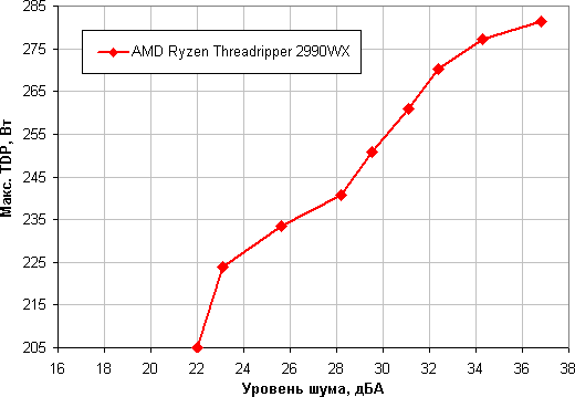 Потребляемая процессором мощность (в сумме по двум разъемам 12 В для питания процессора) меняется от 259 до 276 Вт по мере увеличения температуры процессора от 57 до 73 градусов (по данным мониторинга, напомним, что реальная температура на 27 градусов ниже). Ограничившись указанными выше условиями, построим зависимость реальной максимальной мощности (обозначенной как Макс. TDP), потребляемой процессором, от уровня шума уже в случае AMD Ryzen Threadripper 2990WX: