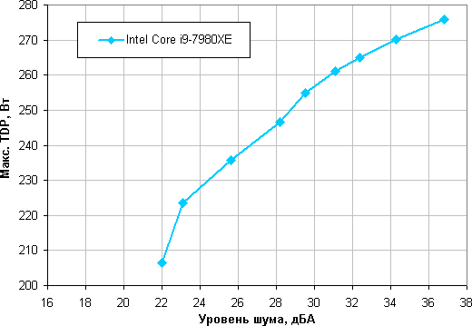 Приняв 25 дБА за критерий условной бесшумности, получим примерную максимальную мощность процессоров, соответствующих этому уровню. Это порядка 230 Вт для процессора Intel Core i9-7980XE. Если не обращать внимания на уровень шума, то пределы мощности можно увеличить где-то до 275 Вт. Еще раз уточним, это в жестких условиях обдува радиатора нагретым до 44 градусов воздухом, при снижении температуры воздуха указанные пределы мощности для бесшумной работы и максимальной мощности возрастают.