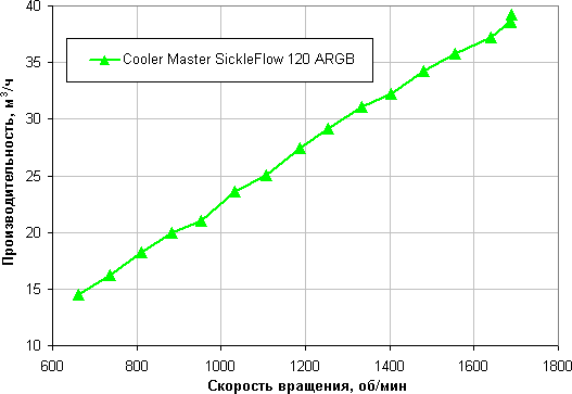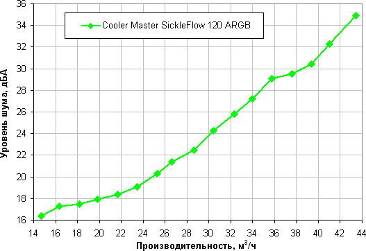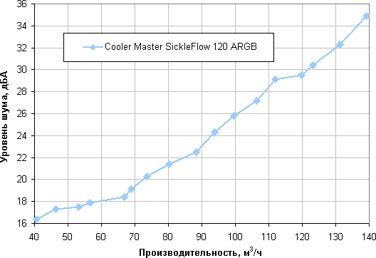 В современных условиях и в потребительском сегменте эргономика, как правило, имеет приоритет над производительностью, поэтому зафиксируем уровень шума на значении 25 дБА. Теперь для оценки вентиляторов достаточно сравнивать их производительность при данном уровне шума.