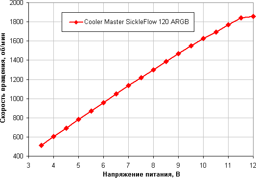 Характер зависимости типичный: плавное и чуть нелинейное снижение скорости вращения от 12 В до напряжения остановки, за исключением некого подобия плато от 11,5 до 12 В. Плато показывает, что в этих вентиляторах есть система поддержания стабильной скорости вращения в зависимости от величины КЗ. При желании вентиляторы можно подключать к 5 В.