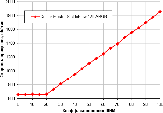 Диапазон регулировки весьма широкий — от 20% до 100% с практически линейным ростом скорости вращения. При КЗ 0% вентилятор продолжает вращаться на постоянной минимальной скорости. Это может иметь значение, если пользователь хочет создать гибридную систему охлаждения, которая при низкой нагрузке работает полностью или частично в пассивном режиме.