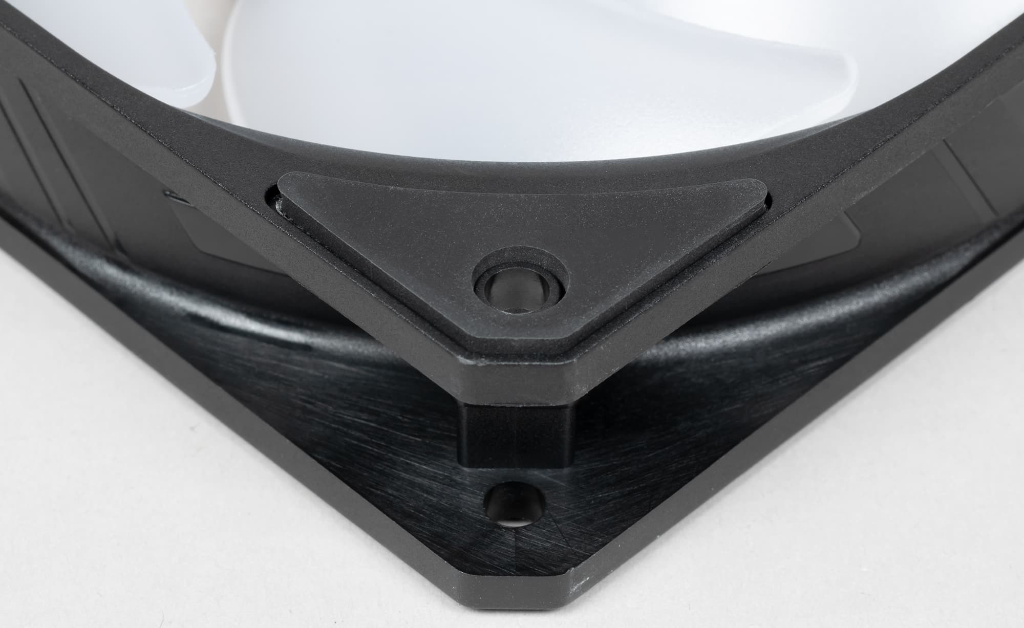 На проушины в углах рамки вентилятора наклеены виброизолирующие резиновые накладки. В несжатом состоянии они выступают примерно на 1 мм относительно плоскости рамки. По замыслу разработчиков, это должно обеспечивать виброразвязку вентилятора от места крепления. Однако если прикинуть соотношение массы вентилятора к жесткости накладок, то становится понятно, что резонансная частота конструкции получается очень высокой, то есть практически никакой виброразвязки быть не может. Кроме того, гнезда, куда вворачиваются крепежные саморезы, являются частью рамки вентилятора, поэтому вибрация от вентилятора будет через саморезы без помех передаваться на то, на чем закреплен вентилятор. В итоге, такую конструкцию проушин можно рассматривать только в качестве элемента дизайна вентилятора.