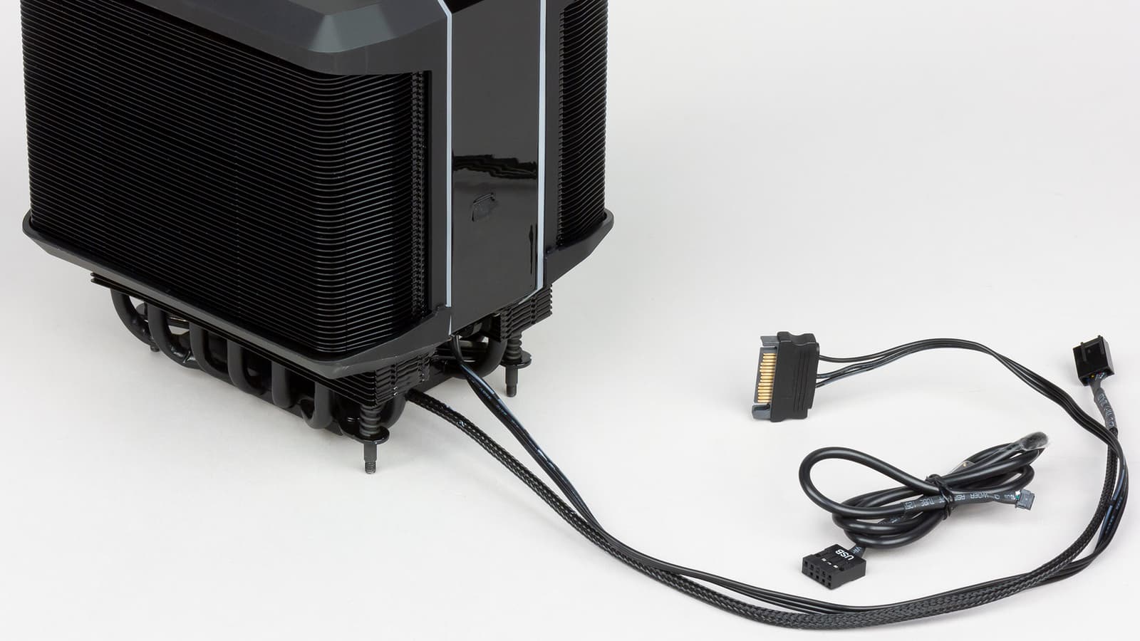 Вентилятор кулера имеет четырехконтактный разъем (общий, питание, датчик вращения и управление ШИМ) на конце кабеля. Провод от вентилятора заключен в скользкую плетеную оболочку. Согласно легенде, оболочка уменьшает аэродинамическое сопротивление, но принимая во внимание толщину плоского четырехпроводного кабеля внутри этой оболочки и ее внешний диаметр, мы в правдивости этой легенды сильно сомневаемся. Впрочем, оболочка позволит сохранить единый стиль оформления внутреннего убранства корпуса.