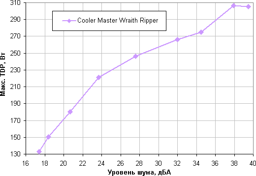 Приняв 25 дБА за критерий условной бесшумности, получим, что примерная максимальная мощность процессора, соответствующего этому уровню, составляет порядка 205 Вт. Если не обращать внимания на уровень шума, то предел мощности можно увеличить где-то до 275 Вт. Еще раз уточним: это в жестких условиях обдува радиатора нагретым до 44 градусов воздухом. При снижении температуры воздуха указанные пределы мощности для бесшумной работы и максимальной мощности возрастают.