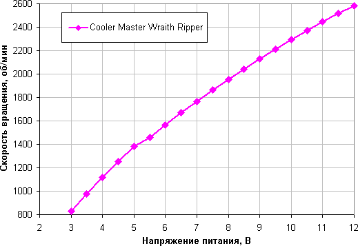 Диапазон регулировки с помощью напряжения заметно уже. Вентилятор останавливается при снижении напряжения до 2,8 В и запускается от 2,9 В.