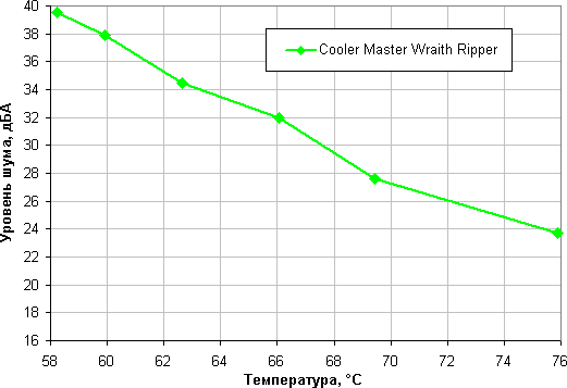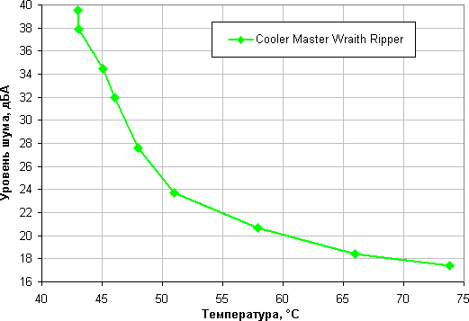 Зависимость уровня шума от температуры процессора при полной загрузке: