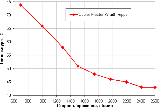 Зависимость температуры процессора AMD Ryzen Threadripper 2990WX при его полной загрузке от скорости вращения вентиляторов: