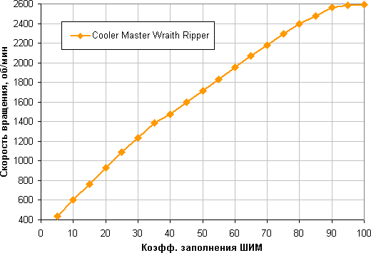 Диапазон регулировки широкий — от 5% до 95% с плавным и близким к линейному ростом скорости вращения. При снижении коэффициента заполнения (КЗ) до 0% вентилятор останавливается (при 1% скорость вращения 195 об/мин), а при повышении до 2% вновь запускается. Это может иметь значение, если пользователь хочет создать гибридную систему охлаждения, которая при низкой нагрузке работает полностью или частично в пассивном режиме.