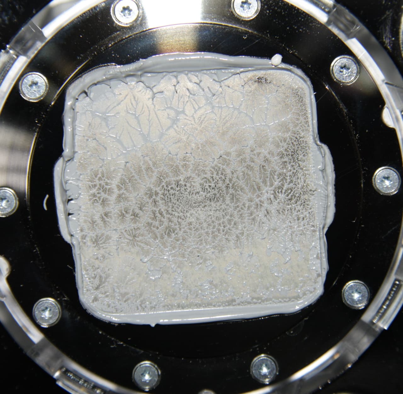 Во всех тестах использовалась качественная термопаста другого производителя, расфасованная в шприц. Забегая вперед, продемонстрируем распределение термопасты после завершения тестов. На процессоре Intel Core i9-7980XE:
