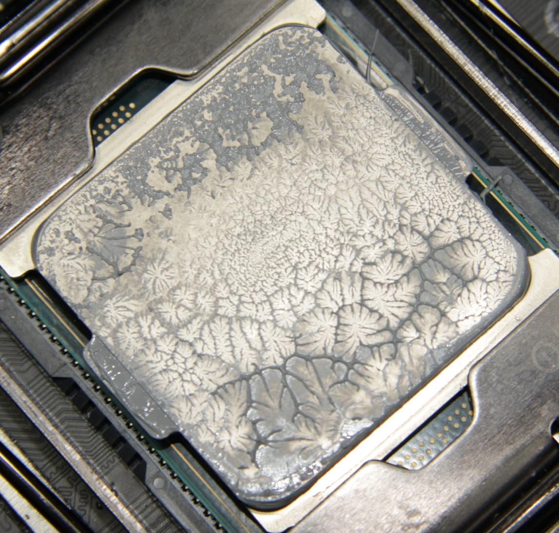 Видно, что термопаста распределилась по всей площади крышки процессора, а примерно по центру есть большой участок плотного контакта. Отметим, что крышка этого процессора сама по себе чуть выпуклая к центру.