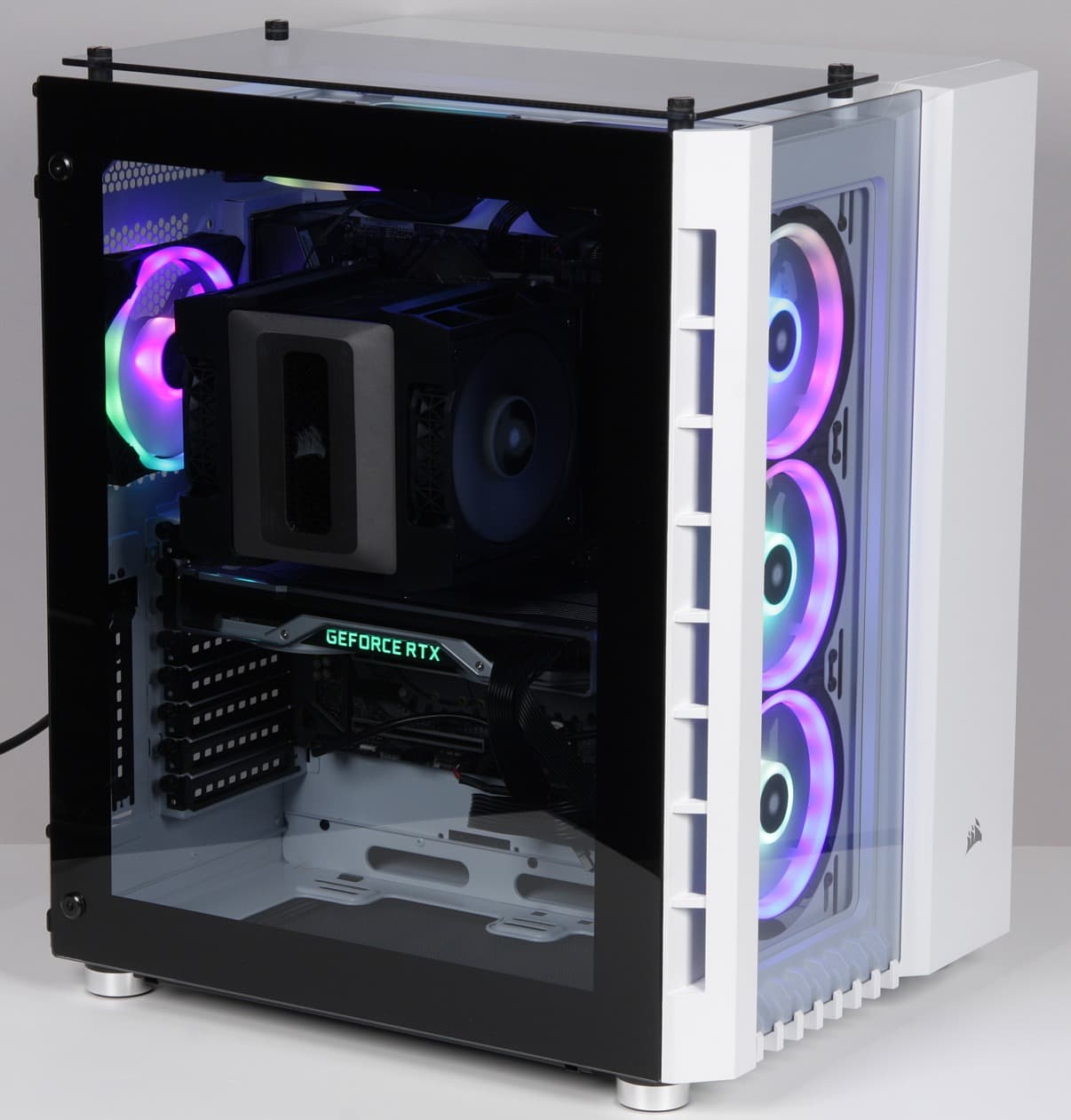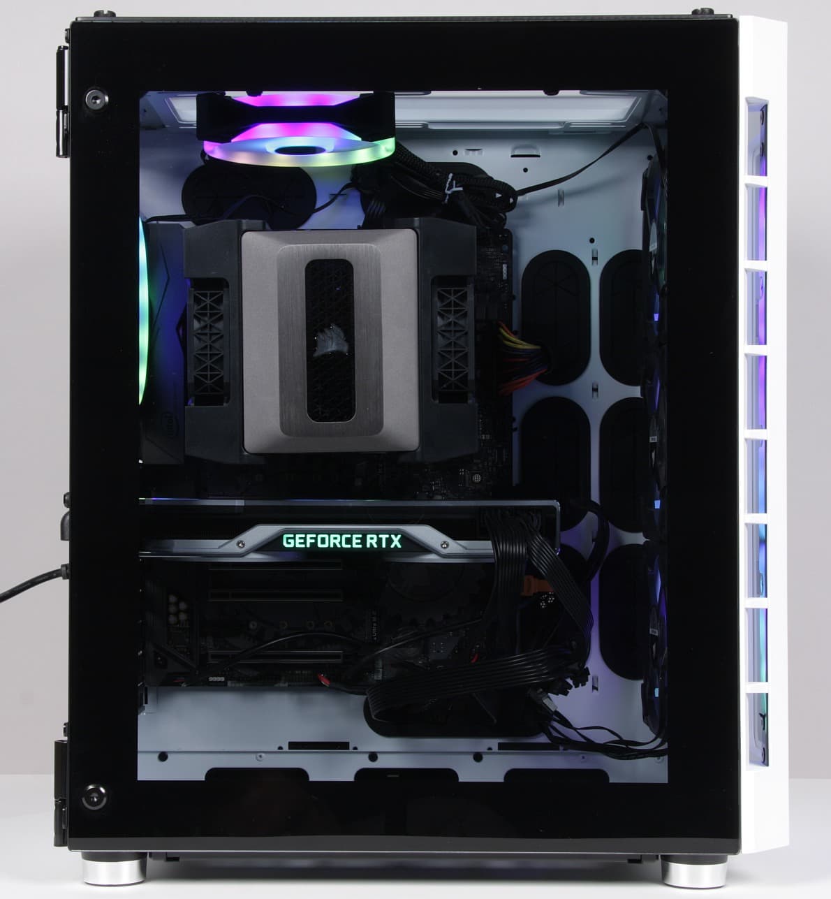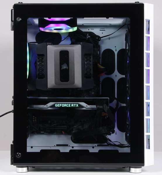 Радиатор СЖО был закреплен на передней съемной панели изнутри, а между ним передней панелью были установлены три вентилятора Corsair LL120 RGB, работающие на вдув внутрь корпуса. Один вентилятор (второй рядом уже не поместился) Corsair QL120 RGB был закреплен на съемной верхней панели и работал на выдув вверх из корпуса. Второй вентилятор Corsair QL120 RGB был установлен на задней стенке корпуса и также работал на выдув. Таким образом, в корпусе было установлено пять вентиляторов, не считая вентилятора в блоке питания. Помпа была закреплена на передней стенке корпуса в отсеке за материнской платой. Работающая система в сборе показана на видео ниже: