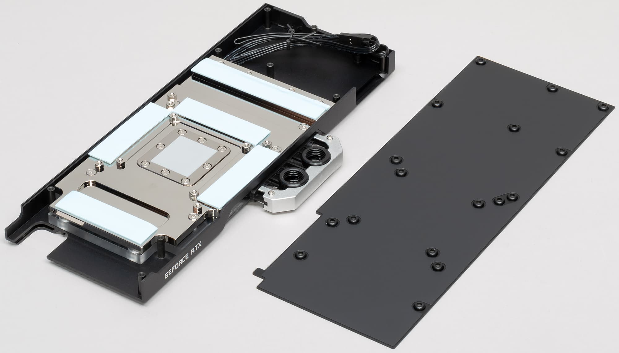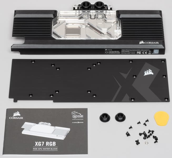 Водоблок состоит из двух основных частей. Верхняя часть объединяет в себе теплосъемник, изготовленный из медного сплава, накладку из прозрачного пластика, формирующую жидкостные каналы, и кожух из алюминиевого сплава, придающий конструкции дополнительную жесткость. Нижняя часть — это пластина из алюминиевого сплава на обратную сторону печатной платы. Она защищает обратную сторону печатной платы, скрепляет обе части вместе и также увеличивает жесткость.