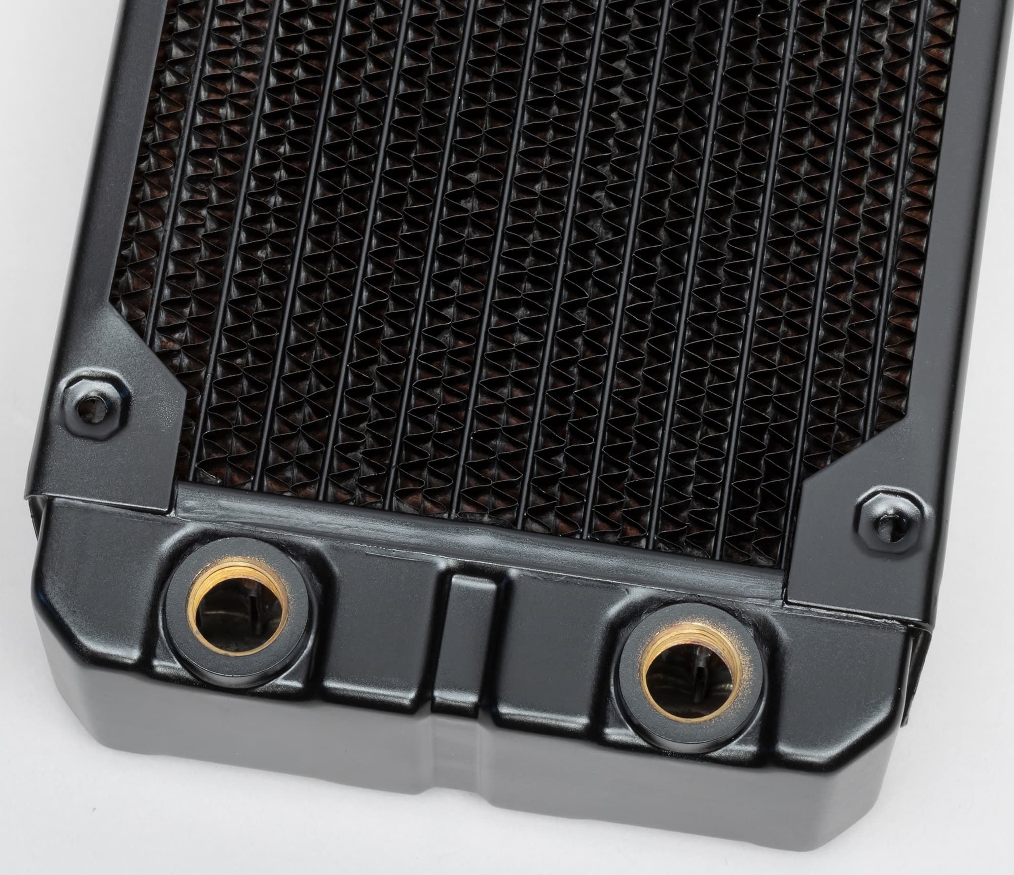 Радиатор целиком изготовлен из медного сплава, видимо, из латуни. Снаружи радиатор имеет стойкое черное матовое покрытие.