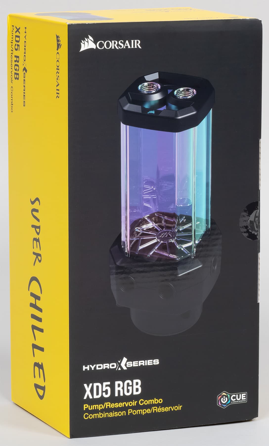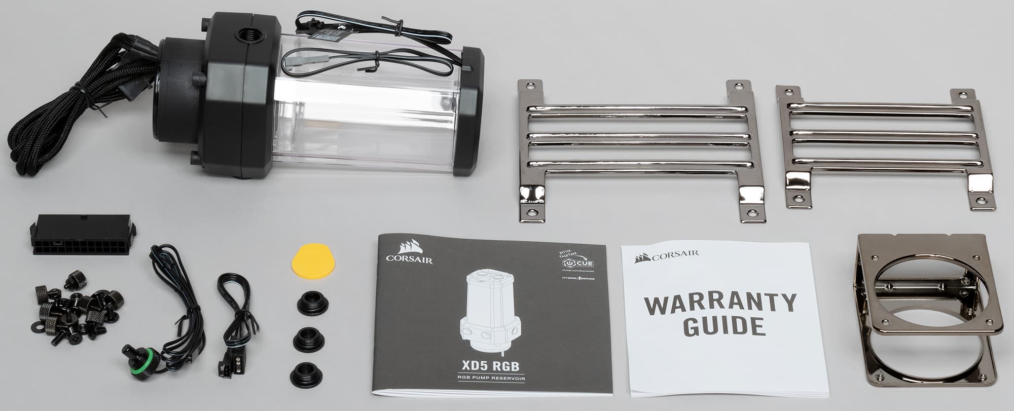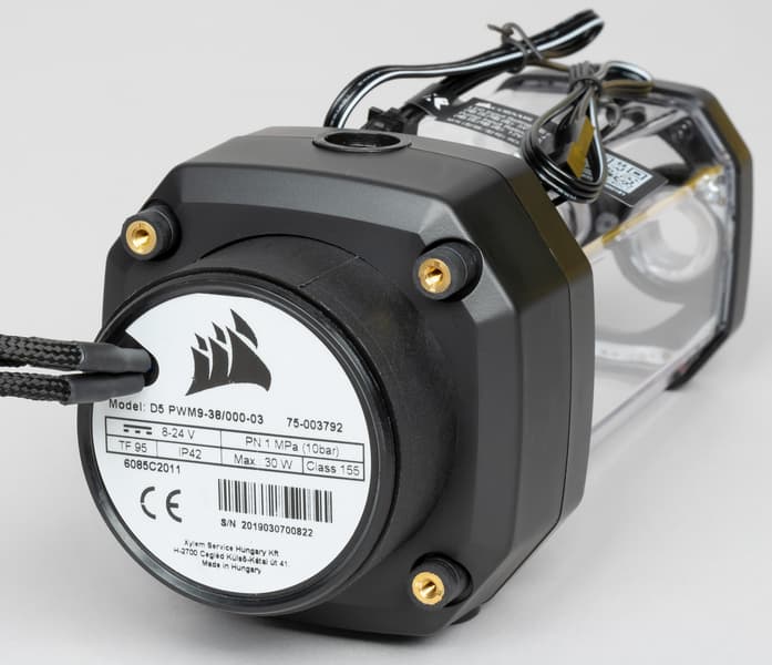 Помпа Hydro X Series XD5 RGB Pump/Reservoir Combo совмещает в себе жидкостный насос и прозрачный резервуар для охлаждающей жидкости. В комплект поставки входят сама помпа, крепеж, термодатчик, переходник для подключения подсветки непосредственно к материнской плате или к стороннему контроллеру, ключ для заглушек и заглушка на разъем ATX, чтобы можно было включать помпу, не включая сам компьютер.