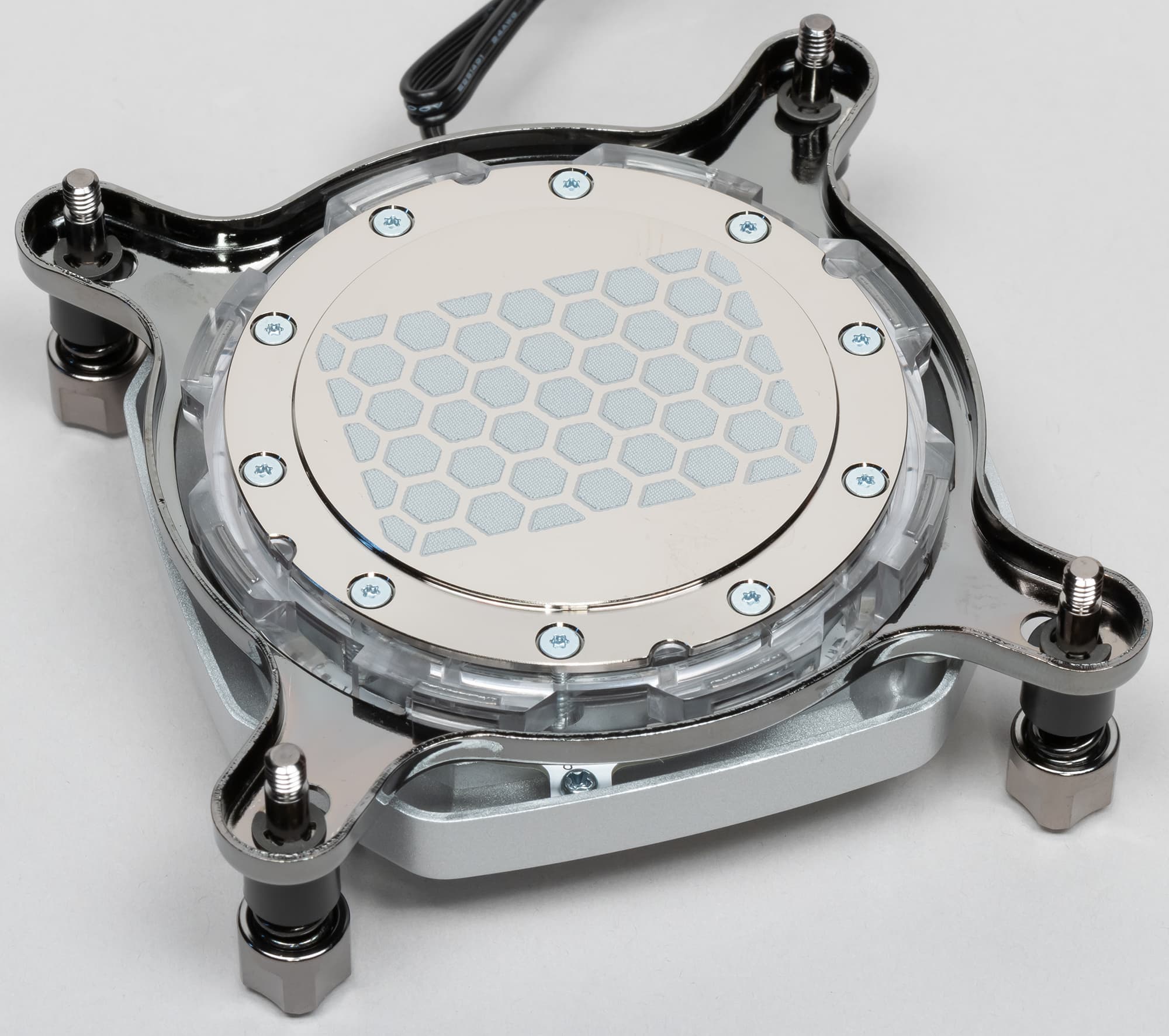 Сверху на теплосъемнике над областью собственно графического процессора есть оребрение, формирующее микроканалы. Индикатором скорости потока жидкости служит небольшая пластиковая вертушка. Водоблок оснащен 16-ю адресуемыми RGB-светодиодами, управляемыми по трехпроводному интерфейсу. От водоблока отходит два кабеля для подсветки (входной и выходной), поэтому его можно включать между другими устройствами.