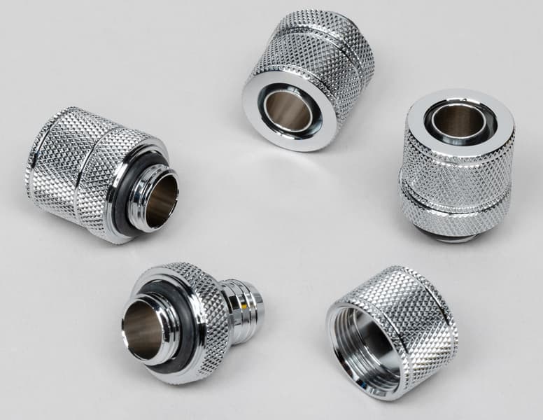 Фитинг для мягких трубок Hydro X Series XF Compression 10/13mm (3/8″ / 1/2″) ID/OD Fitting (то есть для шлангов) подсоединяет шланг к резьбовому отверстию G1/4″. Не очень удобно то, что эти фитинги неповоротные. Поэтому сначала их нужно плотно завернуть в резьбовом гнезде, потом надеть трубку и зажать ее накидной гайкой. Подтяжка резьбового соединения, если оно ослабло, может потребовать снять шланг (а это, в свою очередь, — слить ОЖ). Также при манипуляциях со шлангом он может вывернуть фитинг из резьбового гнезда, что может привести к потере герметичности и протечке. Поэтому перед запуском системы нужно проверять и перепроверять затяжку этих фитингов.