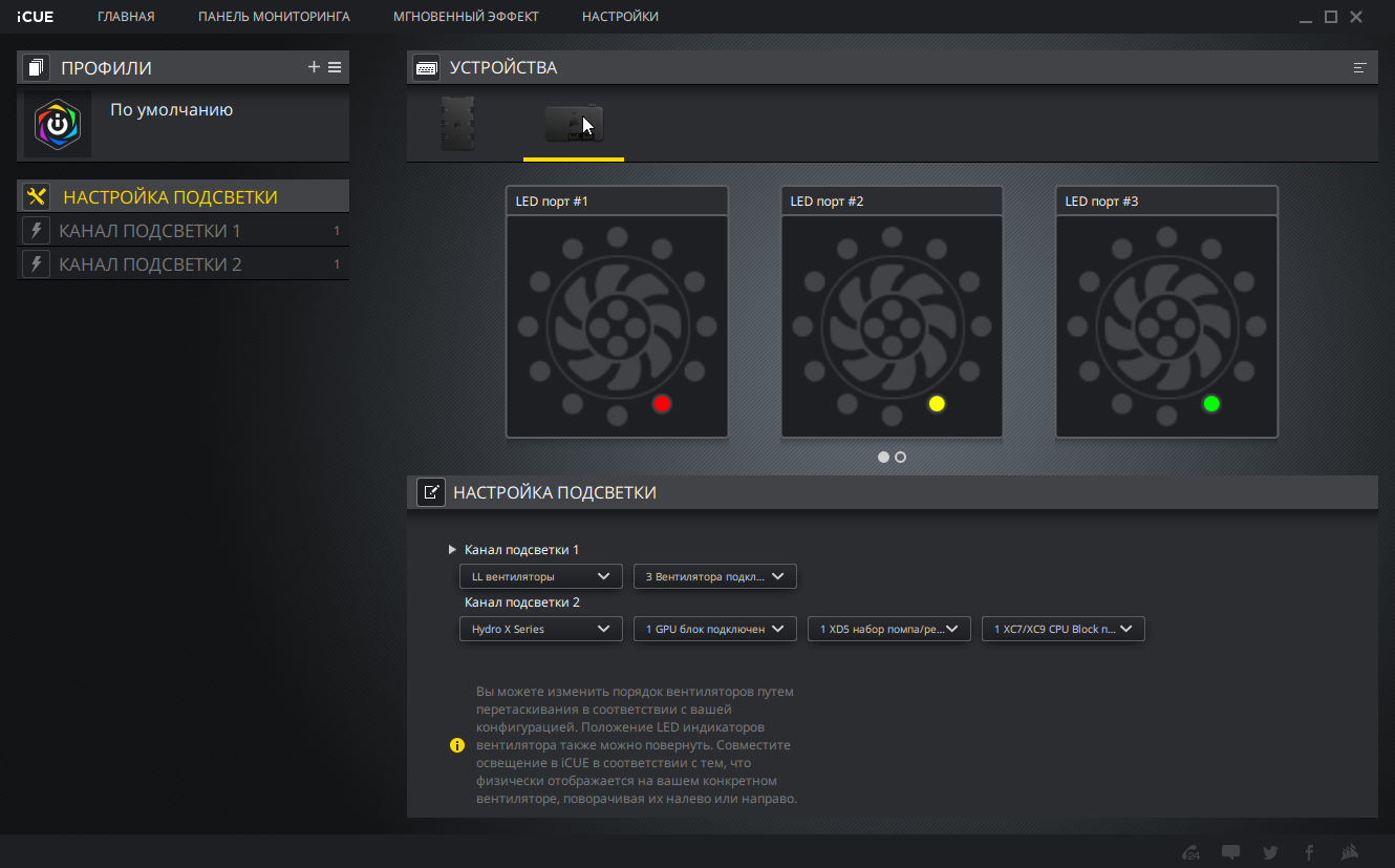Три вентилятора Corsair LL120 RGB подключались через разветвитель к одному каналу контроллера Corsair Lighting Node Pro. Этот контроллер также управляет только подсветкой. Водоблок видеокарты, помпа и водоблок центрального процессора подключались последовательно (в данном порядке) к второму каналу контроллера Corsair Lighting Node Pro. Регулировка скорости вращения помпы и вентиляторов, которые были подключены к разъемам для вентиляторов на материнской плате (в случае помпы — подавался только управляющий сигнал, но не питание), осуществлялась с помощью ШИМ, КЗ для которой выставлялся в программе SpeedFan. Для управления подсветкой штатных вентиляторов и компонентов СЖО применялась программа Corsair iCUE. Отметим, что на один канал контроллера Corsair Lighting Node Pro можно зарегистрировать вентиляторы только одного типа, поэтому для управления подсветкой двух вентиляторов Corsair QL120 RGB мы подключили их к своему контроллеру.