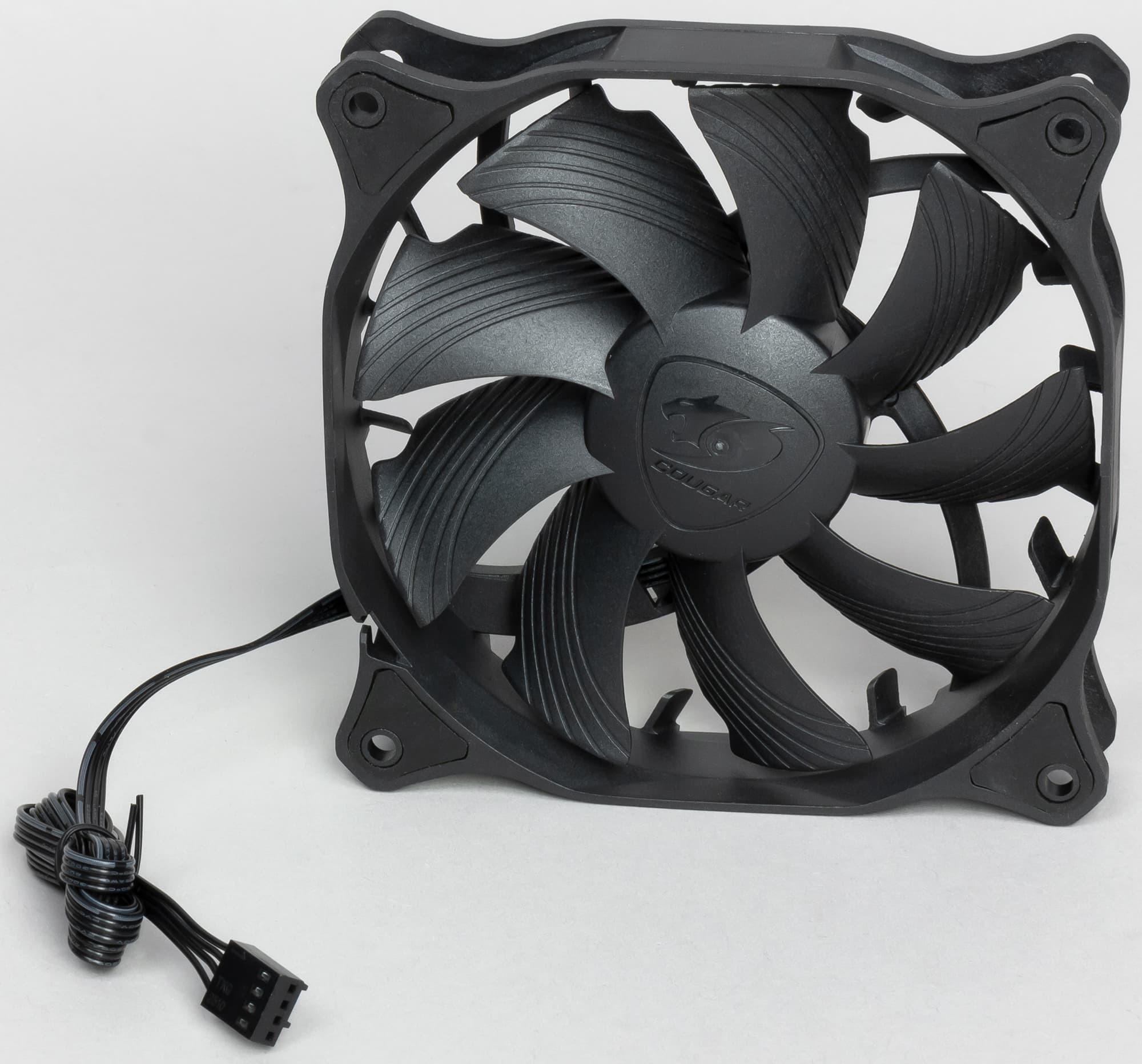Вентилятор имеет четырехконтактный разъем (общий, питание, датчик вращения и управление ШИМ) на конце кабеля. Длина кабеля питания вентилятора составляет всего 60 см. С учетом длины разветвителя (два хвоста по 19,5 см) этого должно хватить.