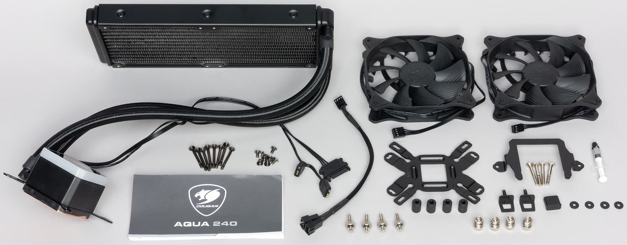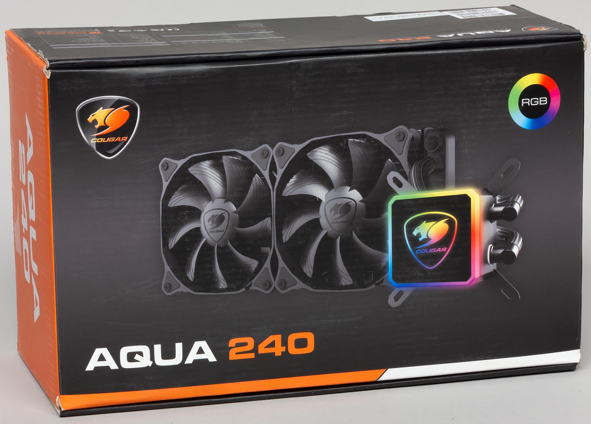 Поставляется система жидкостного охлаждения Cougar Aqua 240 в красочно оформленной коробке из среднего по толщине гофрированного картона. На внешних плоскостях коробки в цвете изображен сам продукт, а также перечислены основные особенности и технические характеристики, приведена комплектация. Надписи преимущественно на английском, но список особенностей продублирован на нескольких языках, включая русский. Для защиты и распределения деталей используются форма из папье-маше, прокладка из вспененного полиэтилена и пластиковые пакеты. Подошва теплосъемника защищена пластиковой пленкой.