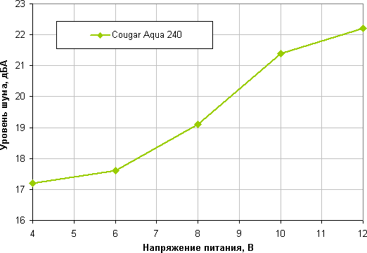 Уровень шума только от помпы относительно высокий, он равен примерно 22 дБА. Приведем зависимость уровня шума только помпы от напряжения.